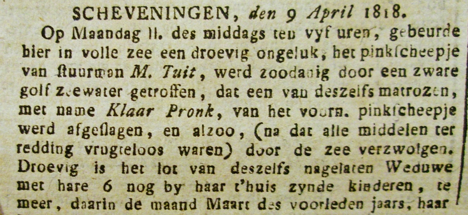 In de huwelijksbijlagen van dochter Klaartje- de vermelding van de door een golf overboord geslagen en verdronken vader Klaar Pronk.