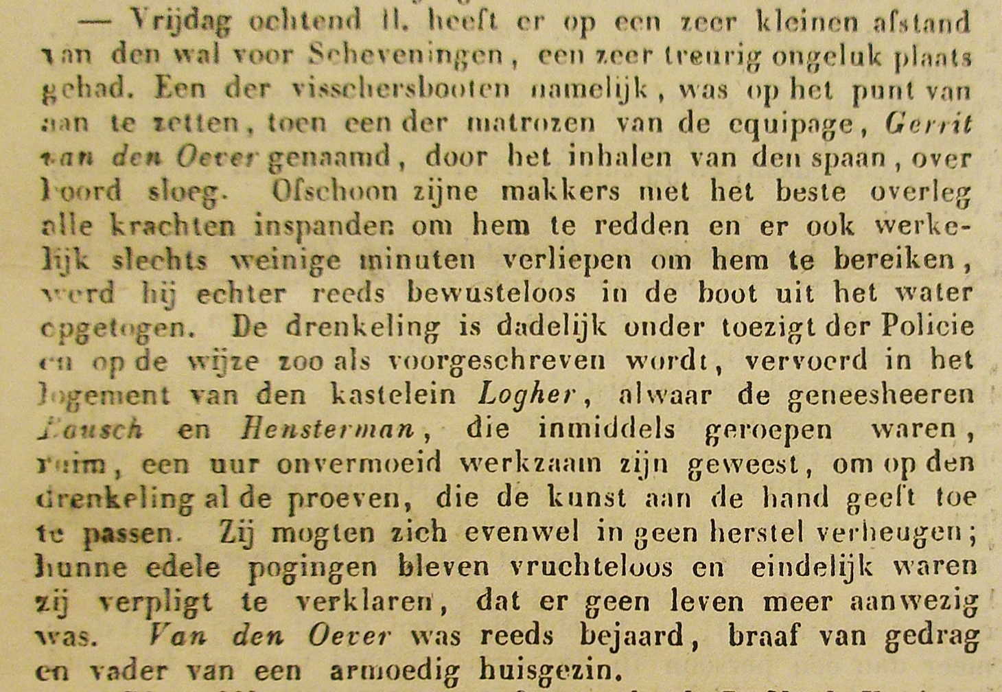 Tijdens het aankomen van zijn schip aan het strand sloeg Gerrit van den Oever overboord en werd bewusteloos uit het water gehaald. De artsen Bausch en Hensterman boden nog hulp maar de drenkeling overleed alsnog.