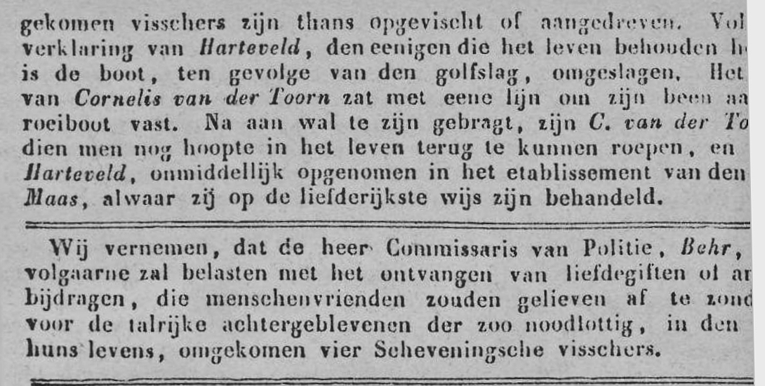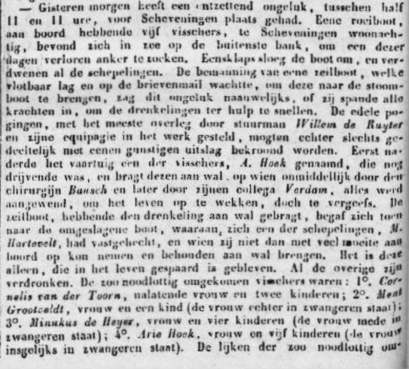 Tijdens een poging om met vijf vissers in een roeiboot een verloren gegaan anker op de buitenste bank te gaan lichten sloeg de boot om waarbij 4 van de 5 vissers verdronken. Schepeling M. Harteveld kon worden gered.
