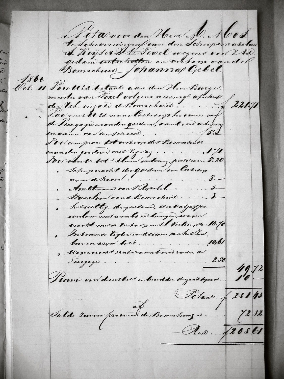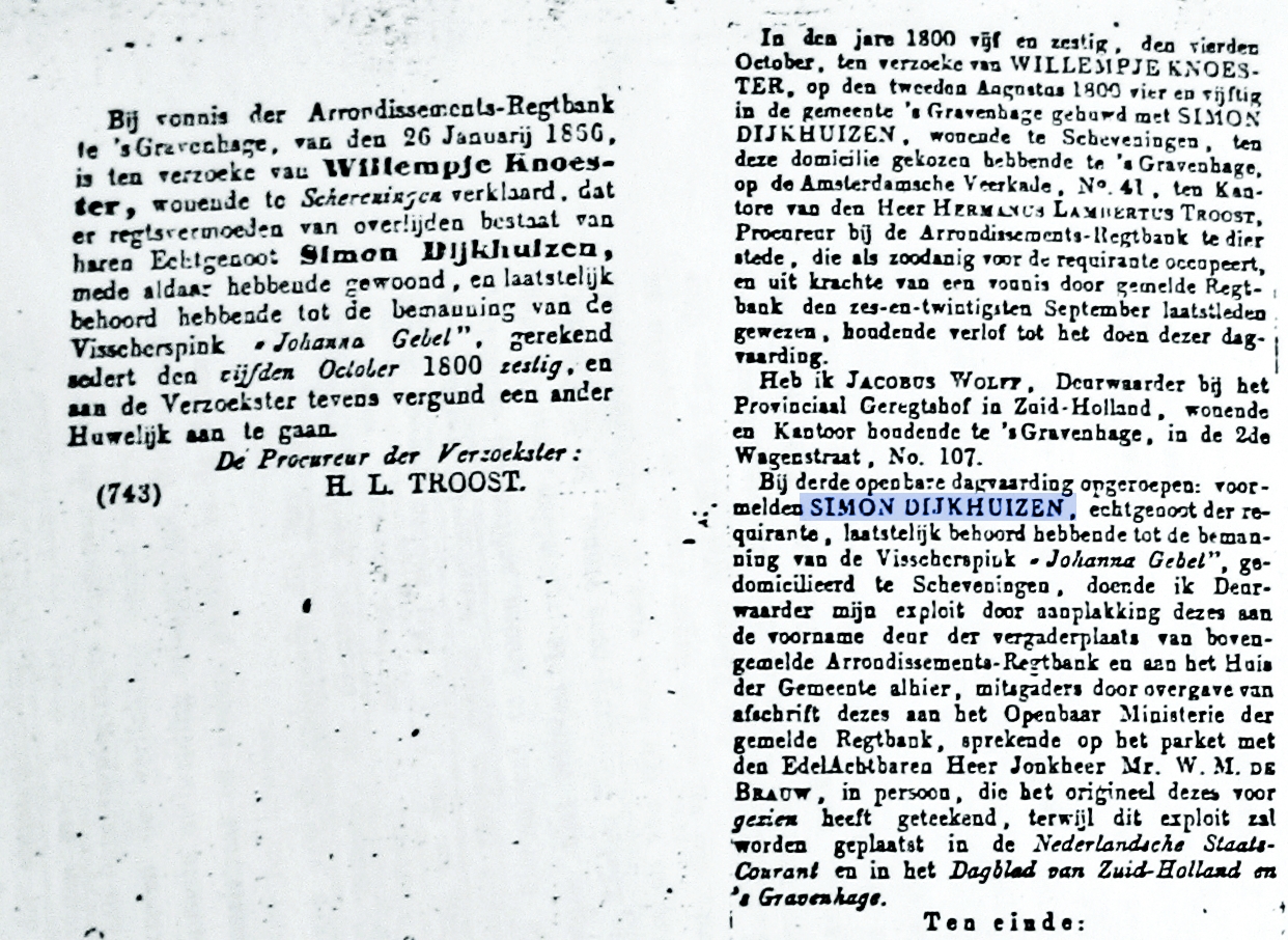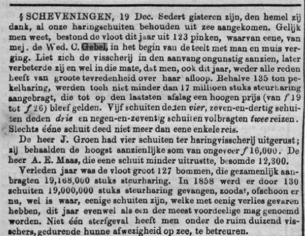 Op 7 oktober kwam er van Texel het bericht dat daar op de Eijerlandsche gronden een Scheveningse haringschuit was gestrand. In het vooronder van het schip bleken zich vier lijken te bevinden. Het vermoeden bestond dat de schuit Johanna Gébel was overzeild waarbij nog vier andere, zich aan dek bevindende vissers, hun dood in de golven hadden gevonden. Daarnaast had het ook gestormd in die dagen waarbij de schuit over de banken bij de Eijerlandsche gronden kon zijn geslagen. Met uitzondering van de zoon van stuurman Pieter Korving waren alle schepelingen vaders van huisgezinnen. Tweeëntwintig kinderen verloren daarbij hun vaders. Scheveninger Albert Mos schoot met dit drama de rederes Gébel, te hulp. Hij vertrok nog op de dag van het bericht met een pink van stuurman A. Kuiper naar Texel om de gevonden lichamen voor het begraven te identificeren. Daarnaast zouden Mos en Kuiper de staat van het schip inspecteren of het mogelijk zou zijn om het schip naar Scheveningen terug te halen.