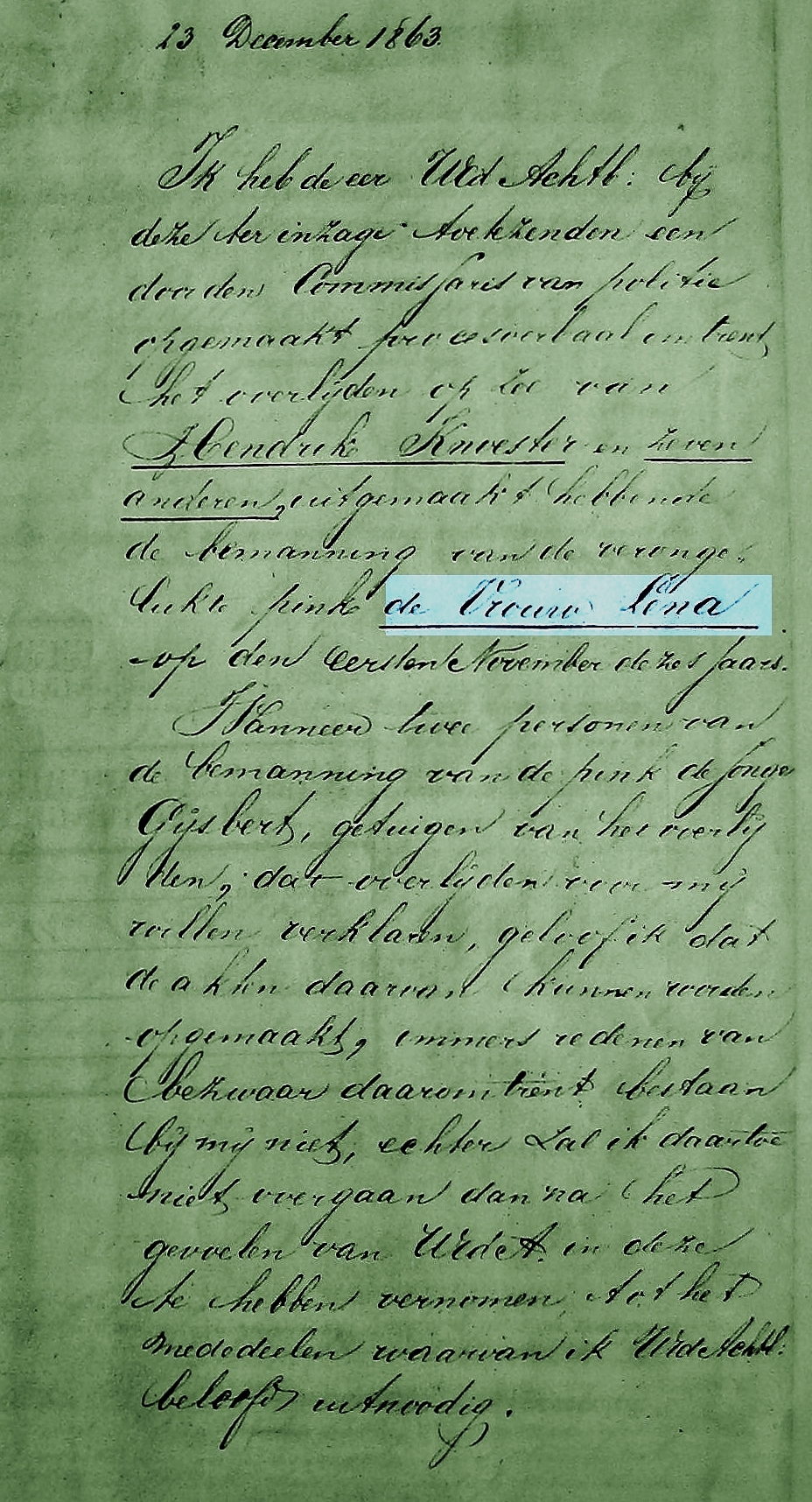 Op 5 november 1863 keerde de pink De Jonge Gijsbert terug uit zee. De stuurman daarvan, Johannes Zuurmond, bracht slechte tijding mee. Op 1 november, twee uur uit de wal van het Engelse Lowestoft, had hij de pink De Vrouw Lena, van dezelfde eigenaresse aangevaren. De pink, met een bemanning van 8 koppen, verdween vrijwel direct in de diepte.