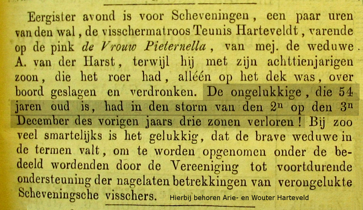* Wouter- en Arie Harteveld zijn broers. Hun broer Cornelis- verdronk dezelfde dag op de 'Neeltje de Jong'. De vader van het drietal - Teunis Harteveld- verdronk in januari 1864 op 'De Vrouw Pieternella'. Nog een zoon en broer -Teunis- verdronk in oktober 1888 op de MA 43 'Secunda'.