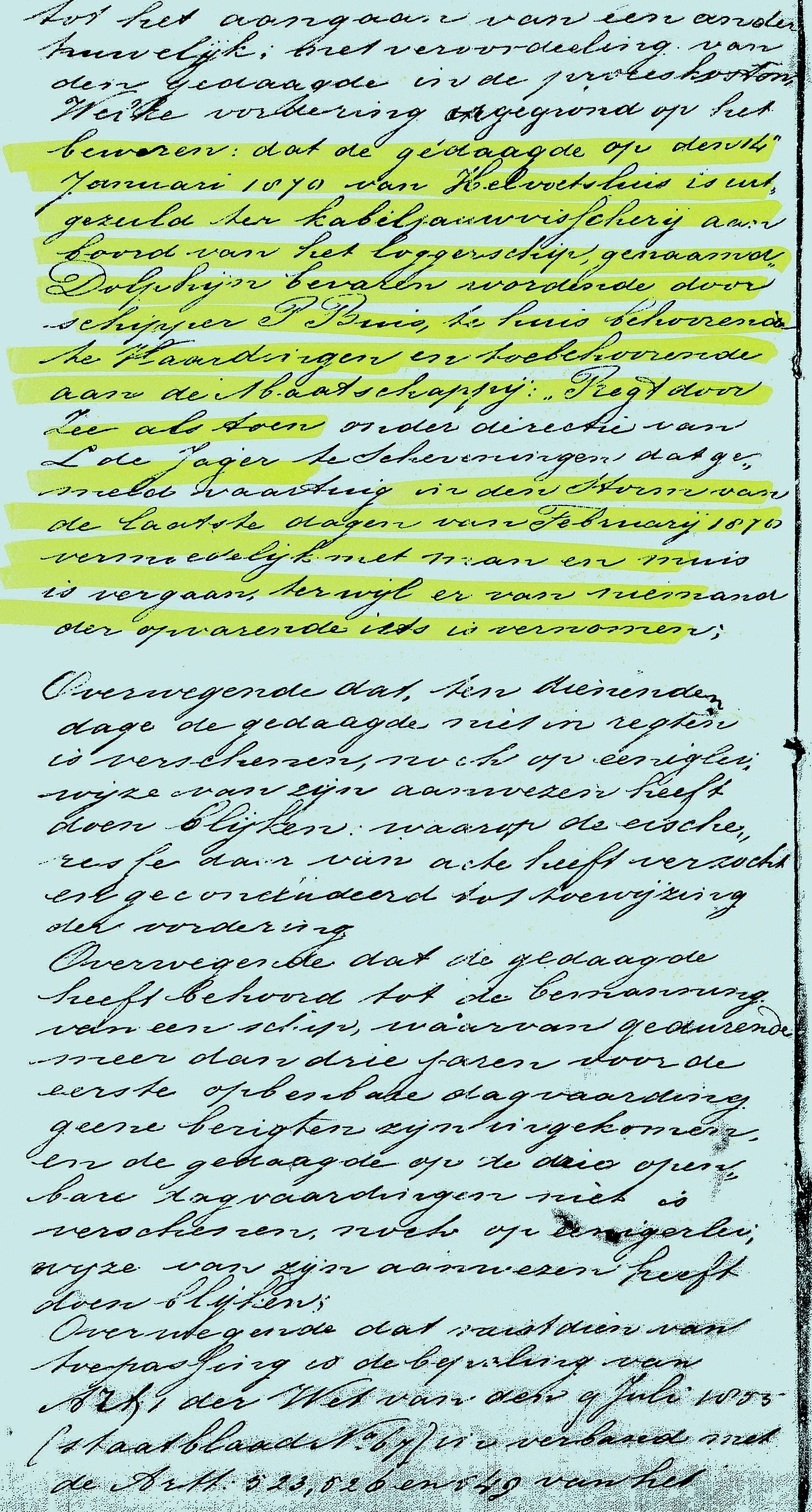Tijdens de storm van 21/22 februari is de zeillogger 'Dolphijn' van de 'Haagsche Zeevischmaatschappij Regt door Zee' op de Grote Visschersbank voor Texel vergaan. Twaalf vissers kwamen daarbij om. De schipper en twee matrozen kwamen van Scheveningen. Zij lieten drie weduwen en zeventien wezen achter. De overige vissers kwamen van Vlaardingen en zijn onbekend gebleven.
