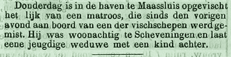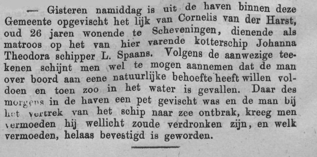 In de haven van Maassluis verdronk matroos Cornelis van der Harst. Na enkele dagen werd het lichaam opgehaald.