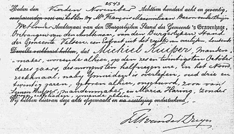 Een misstap of struikeling kostte de ongehuwde matroos Machiel Kuiper het leven nadat hij in de haven van Nieuwediep was gevallen. Andere informatie geeft aan dat de bomschuit in het Noordzeekanaal bij IJmuiden lag. Waar dan ook, het lichaam kon een dag daarna uit het water worden gehaald. Kuiper was in 1855 te 's-Gravenzande geboren maar verhuisde in 1860 met zijn ouders naar Scheveningen.
