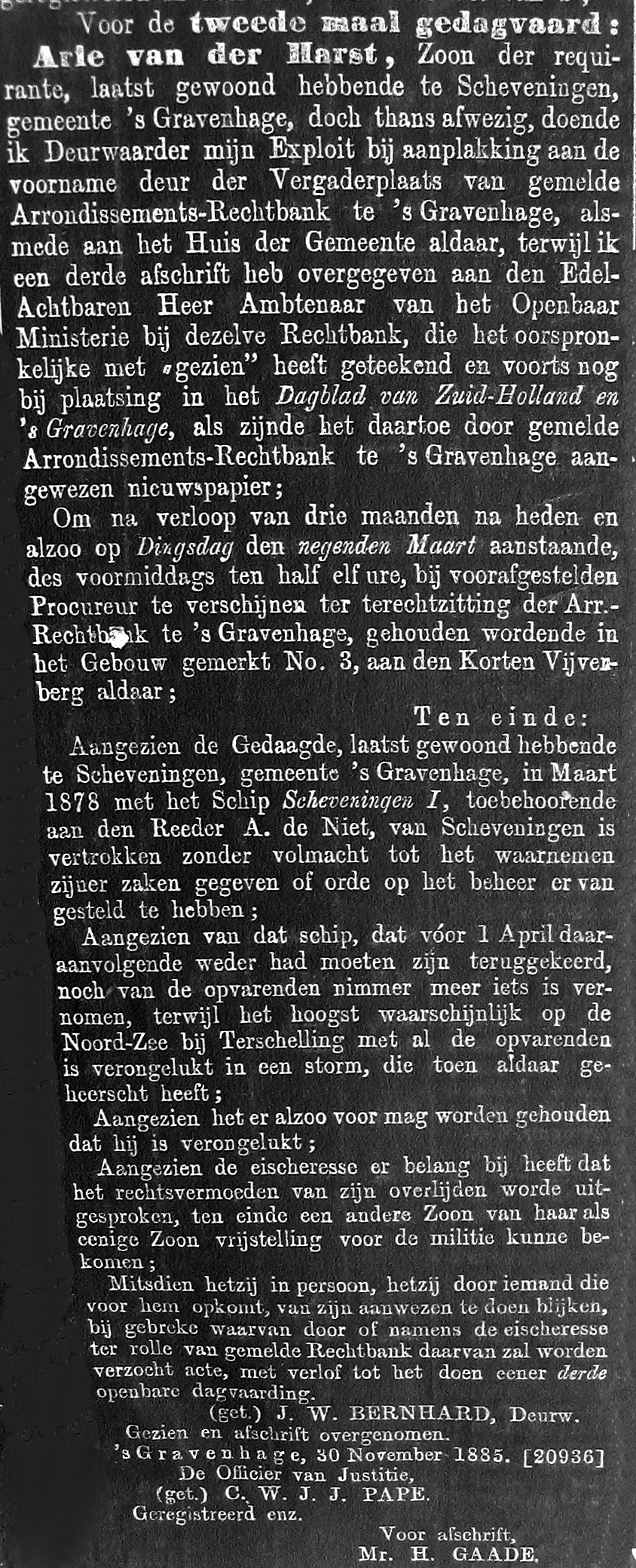 Rond de tweede week van maart bestond er ernstige ongerustheid over het lot van de houten zeillogger Scheveningen I. De logger had op 5 maart vanuit Nieuwendiep zee gekozen. Maar het had gestormd in die dagen en de logger was -met gebroken masten en gesleept door een Engelse vissloep- nog door Scheveningse vissers waargenomen. Bovendien koerste de sleep in de richting van de Hollandse kust aldus de teruggekeerde vissers. Latere berichten luidden echter dat de Engelsman de logger zou hebben losgelaten en de logger in afwachting van andere hulp voor anker was gegaan. Echter eind maart was er nog steeds geen bericht van de logger en bemanning zodat men moest aannemen dat de logger was verongelukt.