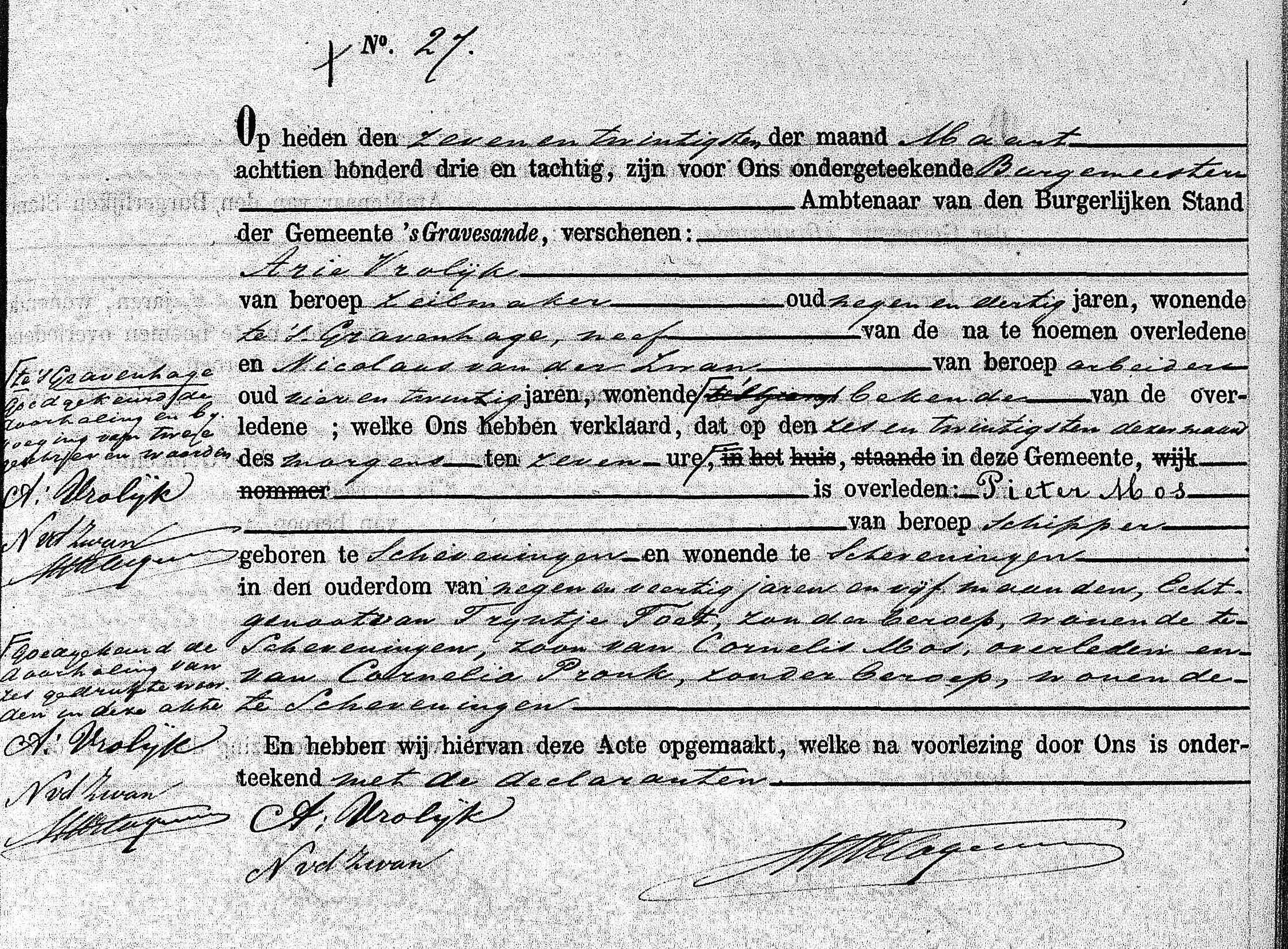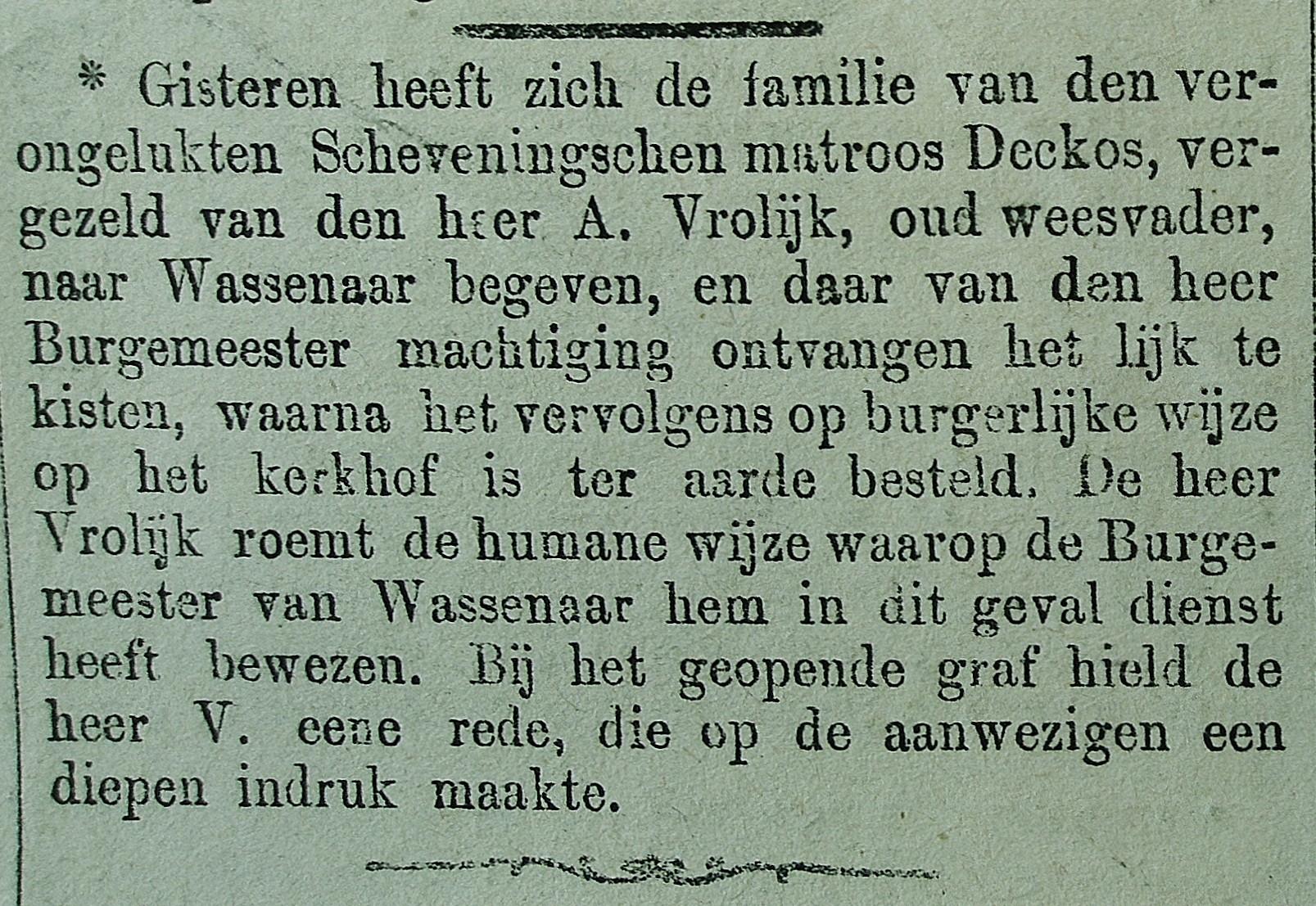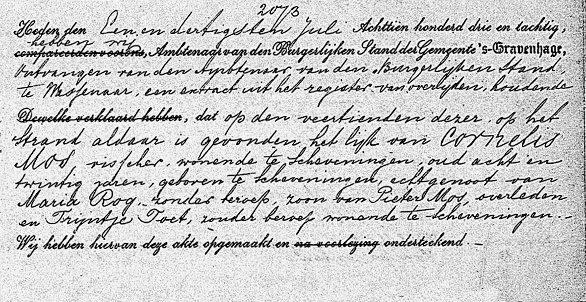 * Cornelis Mos: Op 14 juli spoelde op het strand onder Wassenaar het lichaam aan. Op de 16e juli begaven de nabestaanden van de zwaar getroffen familie Mos zich naar Wassenaar. Bijgestaan door de oud-weesvader A. Vrolijk werd het lichaam aldaar ter aarde besteld.