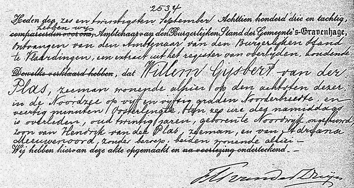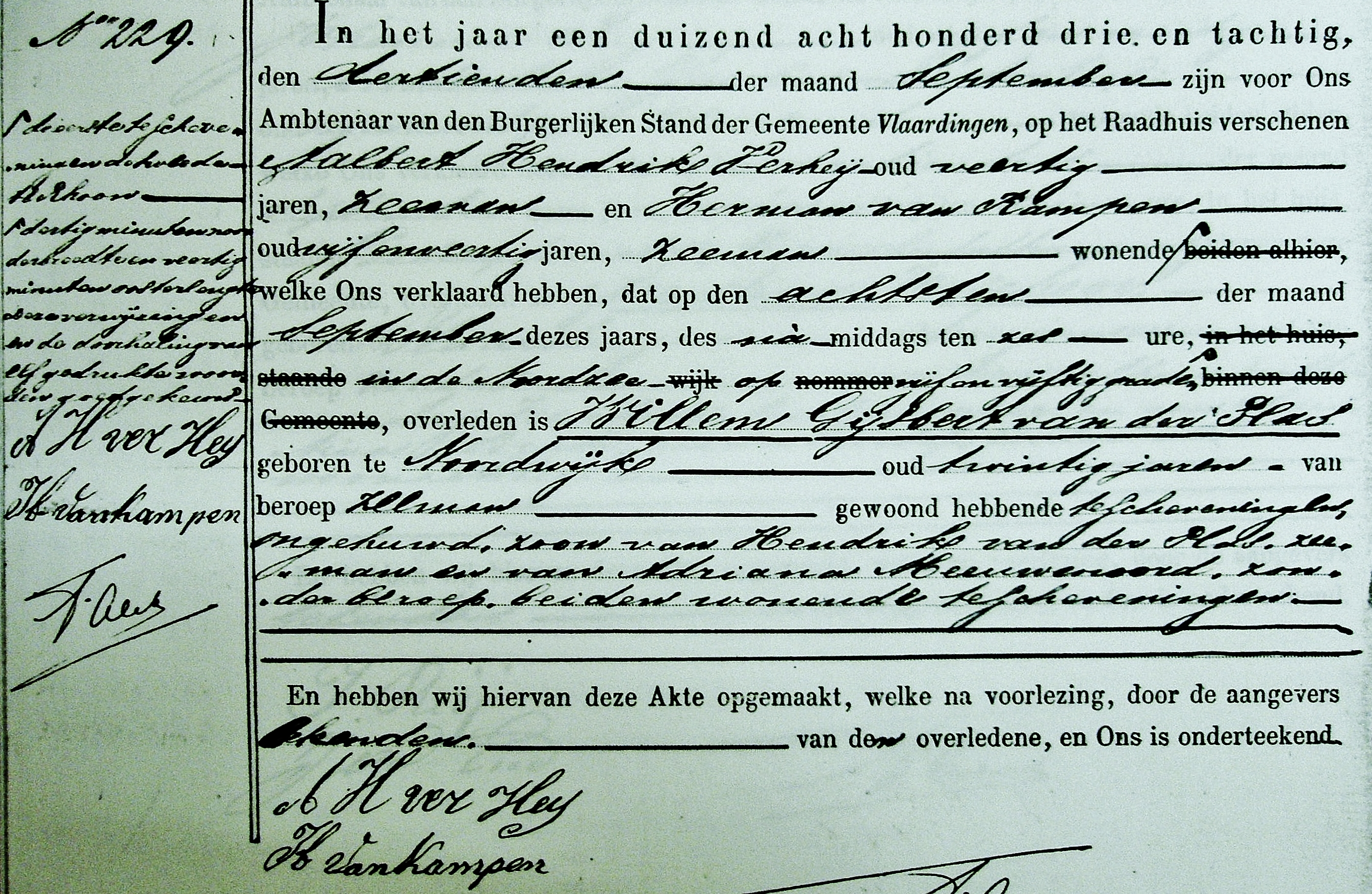 Bij het ledigen van een mand buitenboord sloeg de jonge matroos overboord en verdronk. Hij was te Noordwijk geboren maar woonde te Scheveningen. Het ongeluk werd te Vlaardingen aangegeven.