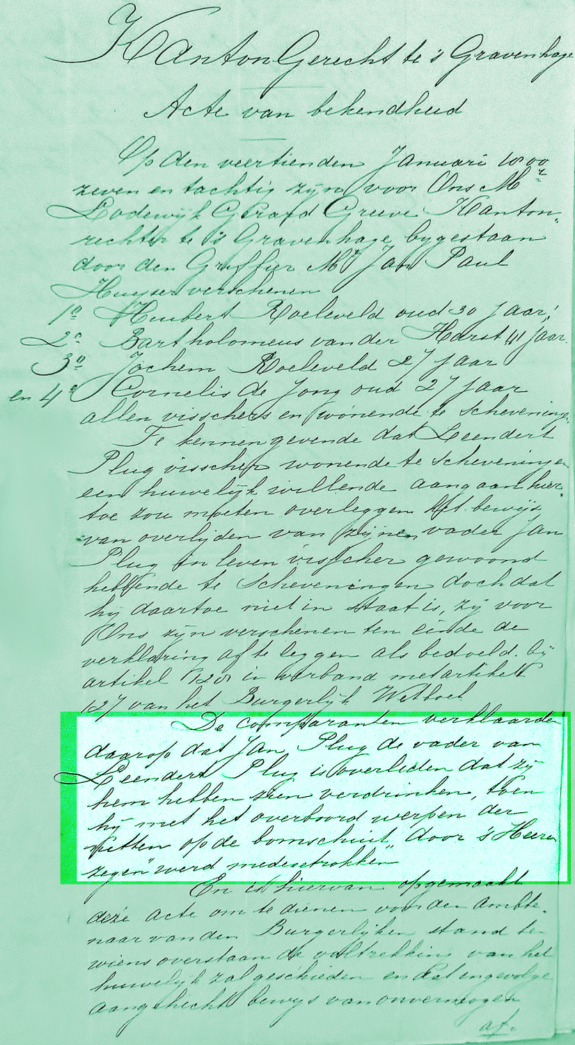 Op de schuit werd tijdens het uitzetten van de netten matroos Jan Plug overboord getrokken en verdronk. Jan Plug was in 1830 te Noordwijk geboren maar was in 1866 met vrouw en kinderen naar Scheveningen gekomen.