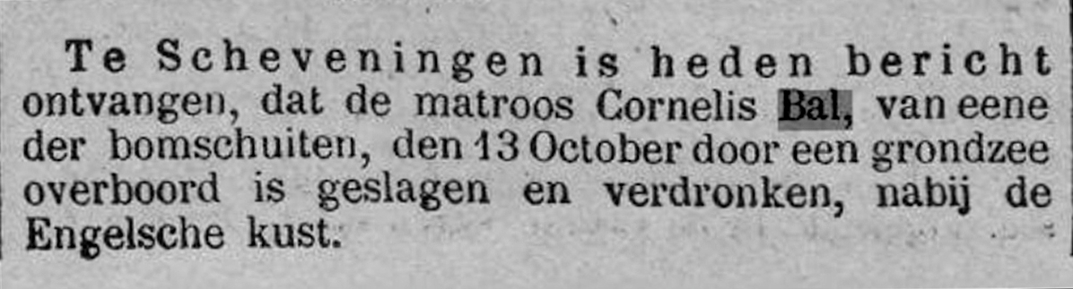 Tijdens stormweer werd schipper Cornelis Bal door een rukwind overboord geslagen. Pogingen, met toewerpen van lijnen en het toesteken van haken, mochten niet meer baten, hij verdween onder water.