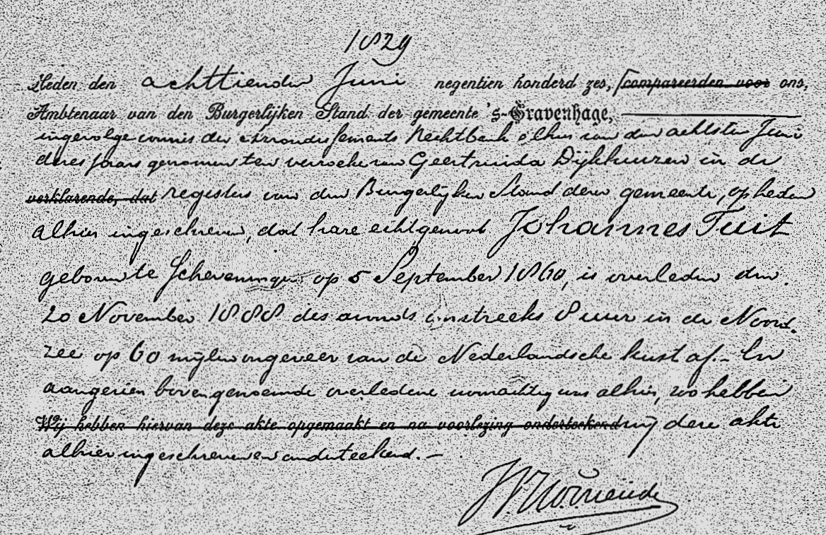 Rond 23 november kwam van de te Vlaardingen binnengelopen schuit het bericht dat op circa 60 mijlen verwijderd van de Nederlandse kust matroos Johannes Tuit overboord was geslagen en verdronken. Tuit liet een vrouw en drie kinderen na.