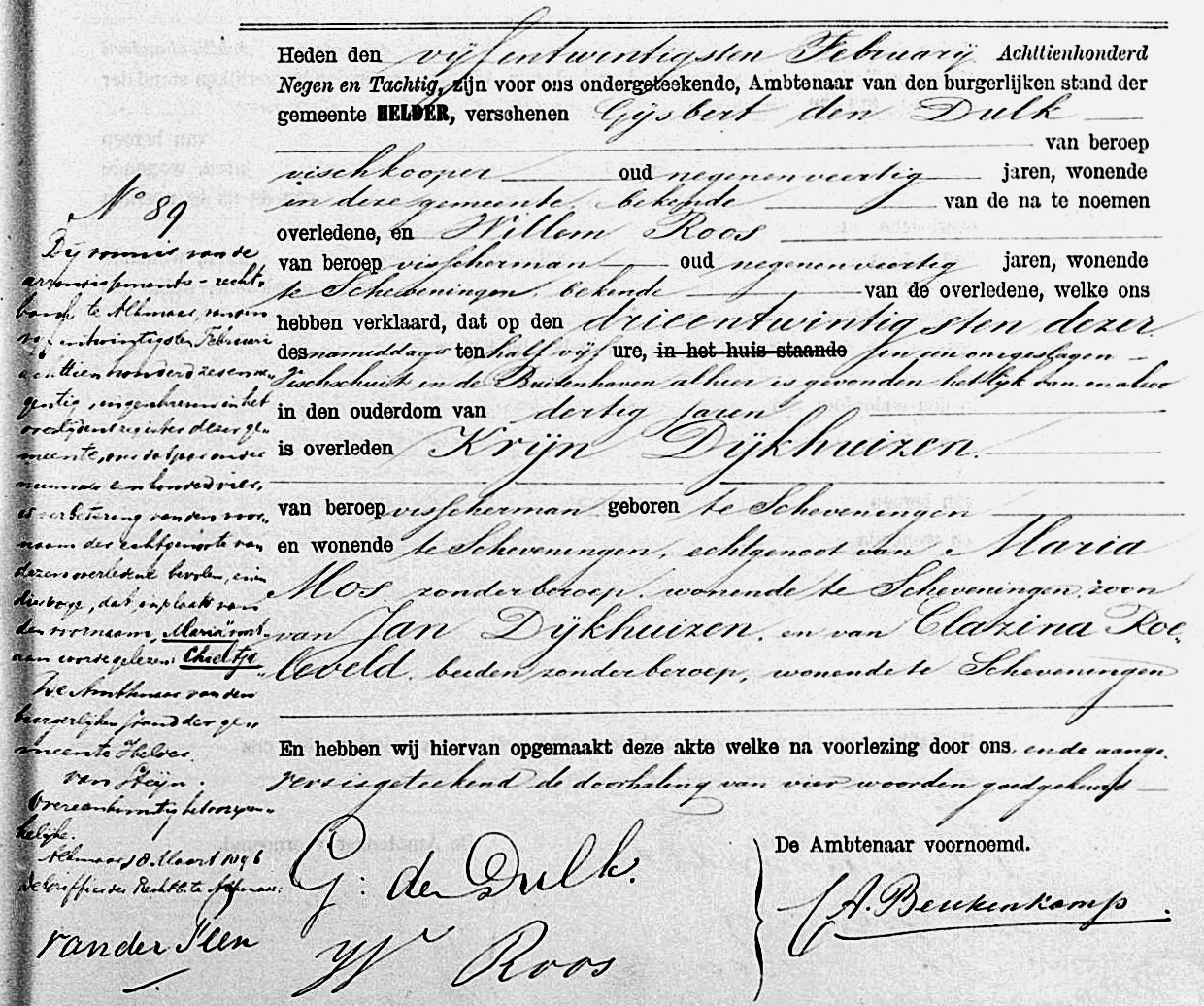 In diezelfde dagen kwam er de jobstijding. Tussen Scheveningen en Katwijk waren op het strand een halve mast, acht luiken en twee zwaarden aangespoeld. De zwaarden waren voorzien van de initialen K. D. H. De letters stonden voor Krijn Dijkhuizen, schipper van de bomschuit De Vier Gebroeders. Er was toen zekerheid dat de bomschuit tijdens de storm met zeven vissers was vergaan.