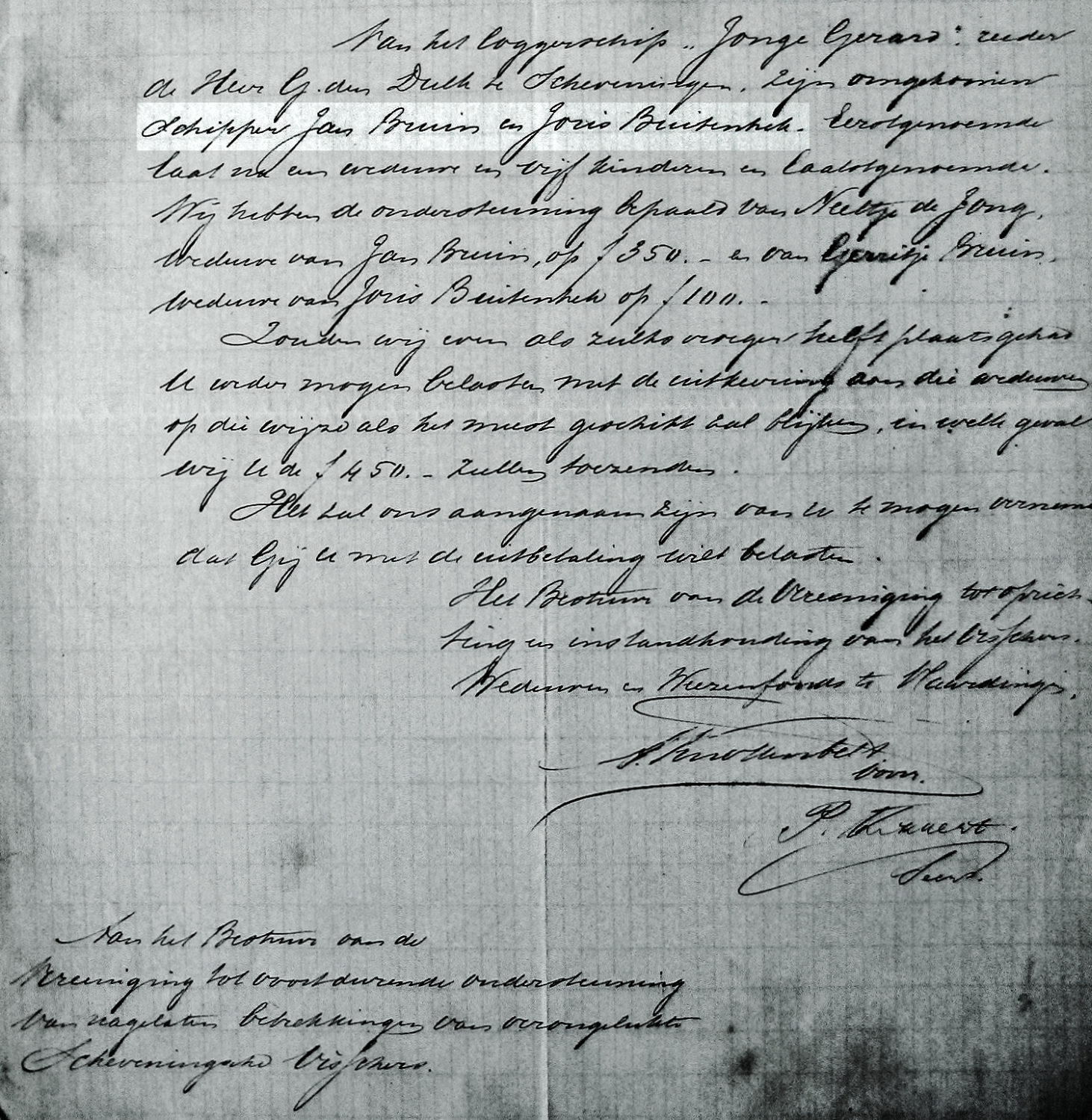 De zeillogger lag ter hoogte van de Doggersbank aan het trawlnet toen op het punt van inhalen van het net slechts schipper Jan Bruin, matroos Joris Buitenhek en matroos Dijkhuizen zich al aan dek bevonden. Het stormde niet maar er stond een krachtige wind met een lastige zee. De rest van de bemanning bevond zich nog benedendeks om hun schoeisels e.d. aan te trekken. Nog maar net had schipper Bruin de twee matrozen aangeraden zich goed vast te houden toen een hevige grondzee de logger op z’n kant gooide. Doordat de logger nog aan het trawlnet lag ging het niet geheel plat. Echter schipper Bruin, de matrozen Buitenhek en Dijkhuizen waren daarbij als het ware opgenomen en overboord gesmeten. Dijkhuizen kon nog de lijn van de uitstaande trawl grijpen en zich met veel krachtinspanning naar de verschansing toe trekken. Intussen was de overige bemanning bovendeks gekomen en konden de om hulp schreeuwende Dijkhuizen binnenboord trekken. De beide andere waren echter te ver van het schip verdaagd waarbij men moest toezien dat zij alle moeite hadden om zich boven water te houden. De bemanning kapte daarop haastig het trawlnet waardoor de logger vrijer in haar beweging kon worden. Echter wat men ook deed, men kon de logger maar niet voldoende onder wind krijgen waardoor een draai gemaakt kon worden om de twee om hulp roepende collega’s te redden. Kennelijk waren de twee de zwemkunst meester want zij zwommen nog wel een kwartier met hun laatste krachten achter de logger aan. Uiteindelijk begaven hun krachten het zodat de Johannes Bruin en zijn zwager Joris Buitenhek in de diepte wegzonken. Johannes Bruin liet een weduwe met 5 kinderen na. Zijn zwager Buitenhek had geen kinderen.