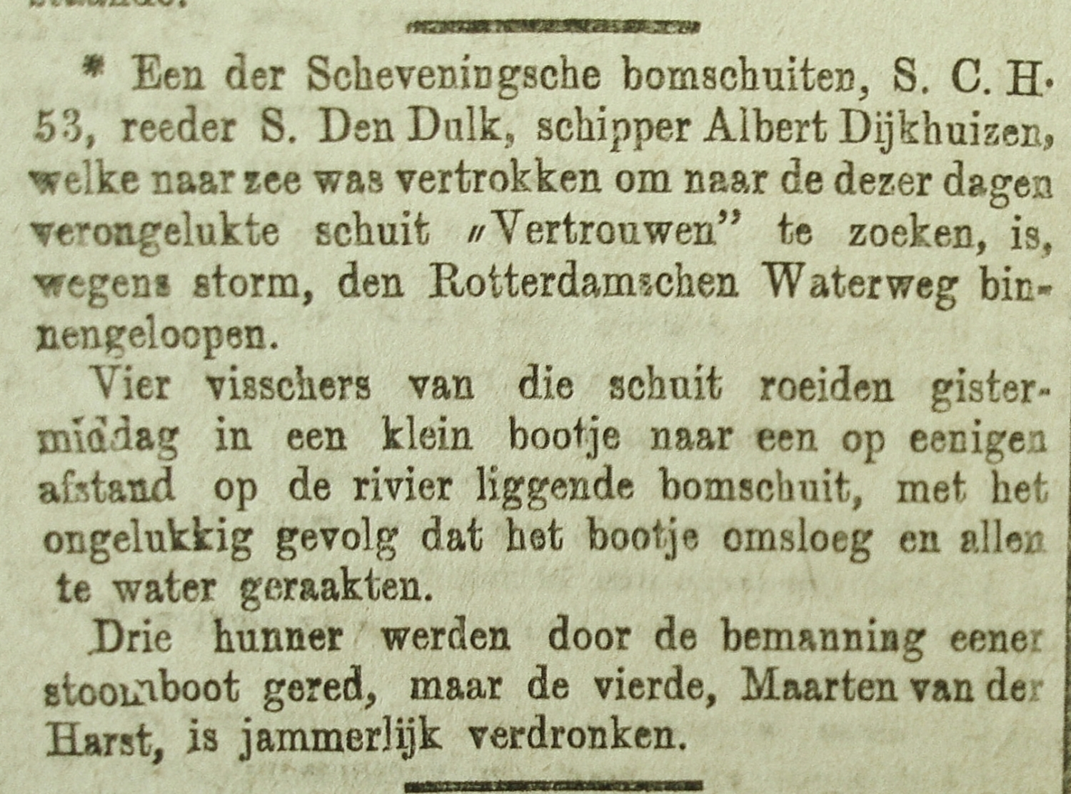 Op de Rotterdamse Waterweg hadden twee Scheveningse bomschuiten een veilige ankerplaats opgezocht in afwachting van beter weer buitengaats. Blijkbaar hadden zij hun schuiten niet aan elkaar vastgemaakt want de reddingsloep van de ‘Wouter’ moest er aan te pas komen om hun verderop gelegen collega’s een bezoek te brengen. Vier vissers roeiden vervolgens over de snelstromende Waterweg. Echter daarbij sloeg de sloep om en alle vier raakten te water. Drie mannen konden nog door een passerende stoomboot uit het water worden gehaald. Martinus Cornelis van der Harst kon niet meer worden gered.