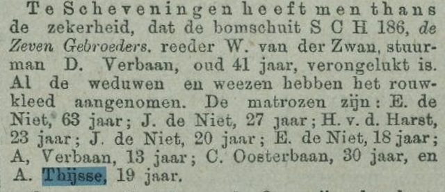 Daniël- en Arie Verbaan zijn vader en zoon. De broer van Daniël, Johannes Huibert- verdronk in september 1901 bij het aan boord gaan van de bomschuit SCH 278 'Alice' in de haven van Vlaardingen.