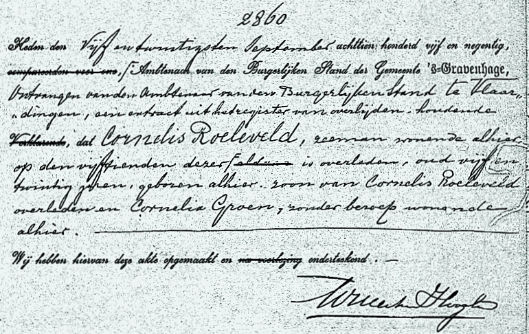 Op 25 september de aangifte te Vlaardingen dat Cornelis Roeleveld op 15 september op zee is overleden.