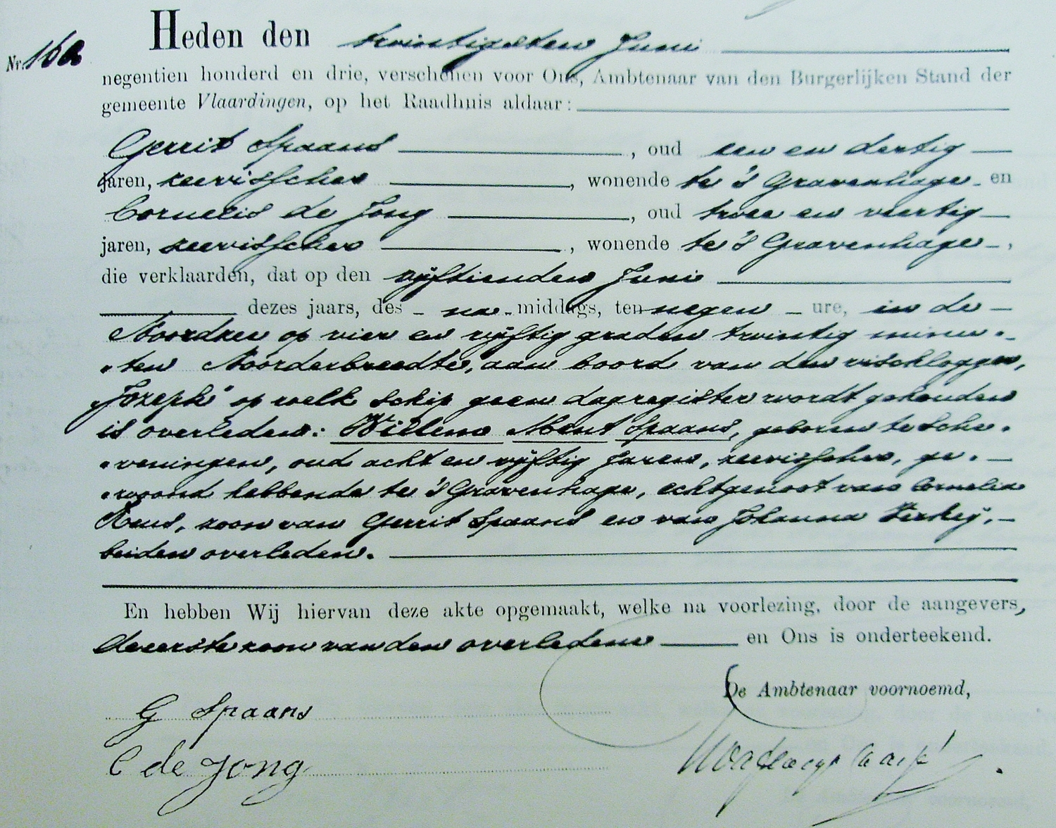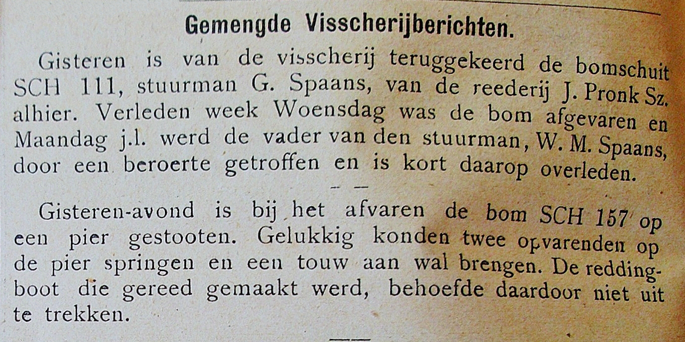 Aan boord van de bomschuit kreeg Willem Ment Spaans een beroerte waaraan hij overleed. Zijn zoon Gerrit was schipper op de schuit. Spaans werd te Vlaardingen aan wal gebracht.