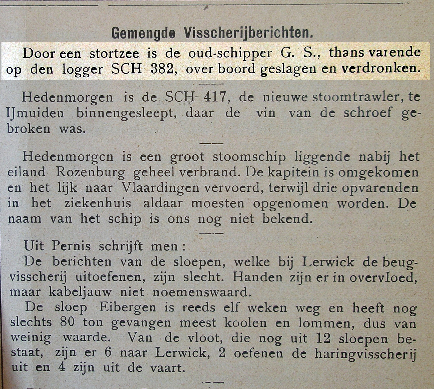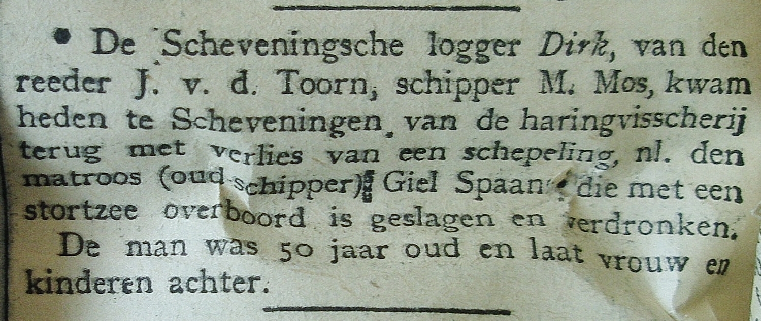 De logger moest de haringvisserij voortijdig onderbreken. Matroos Machiel Spaans was door een stortzee overboord geslagen en verdronken waarna de logger huiswaarts moest keren.