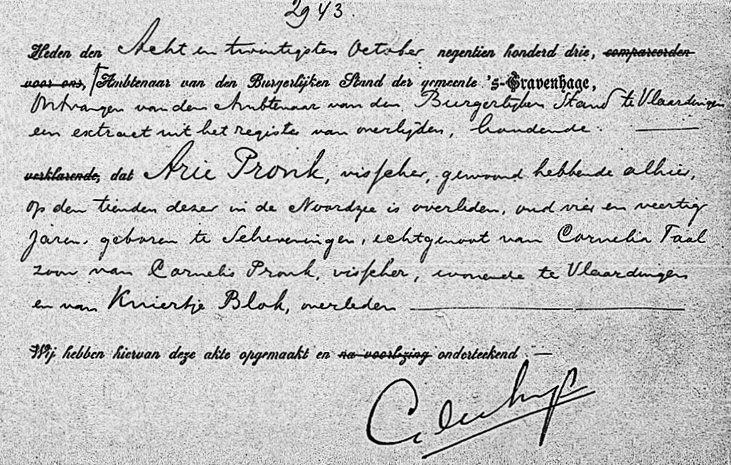Tijdens slecht weer moest de bomschuit met een handpomp worden lens gehouden. Matroos Arie Pronk die daar mee bezig was kreeg een slag water, sloeg overboord en was niet meer te redden. Hij liet een zwangere vrouw en zes kinderen na.