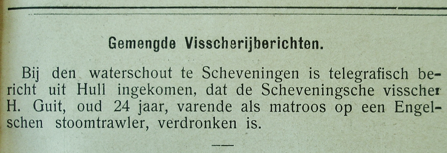 Het was al maart 1905 toen de waterschout te Scheveningen vanuit de Britse vissersplaats Hull een telegram kreeg dat de Scheveningse Herman Guijt, varende als matroos op een Britse stoomtrawler, was verdronken. Guijt was ongehuwd.