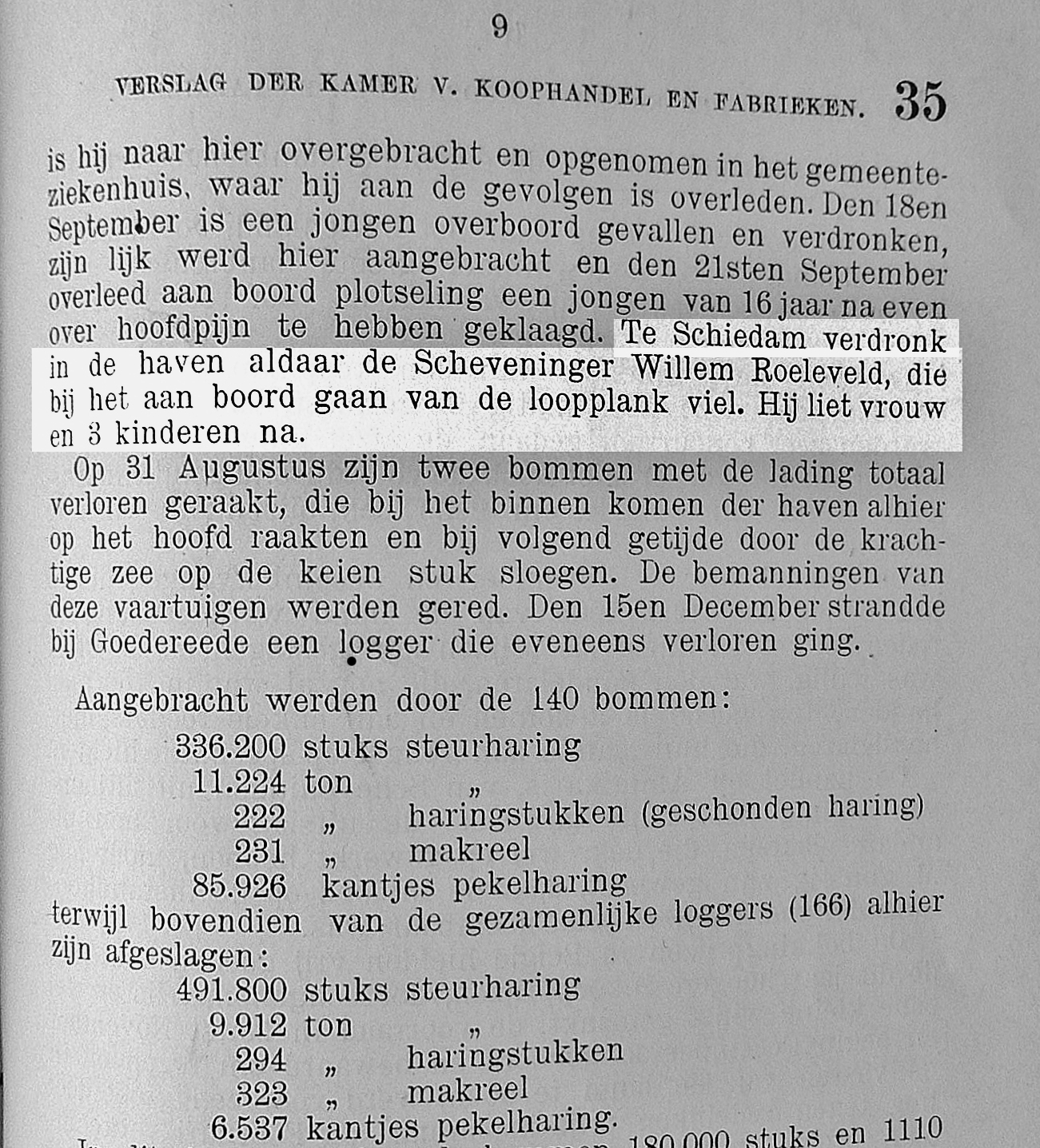 In de haven van Schiedam viel Willem Leenderd Roeleveld bij het aan boord gaan van zijn schip van de loopplank en verdronk daarbij. Roeleveld liet een vrouw en drie kinderen na.