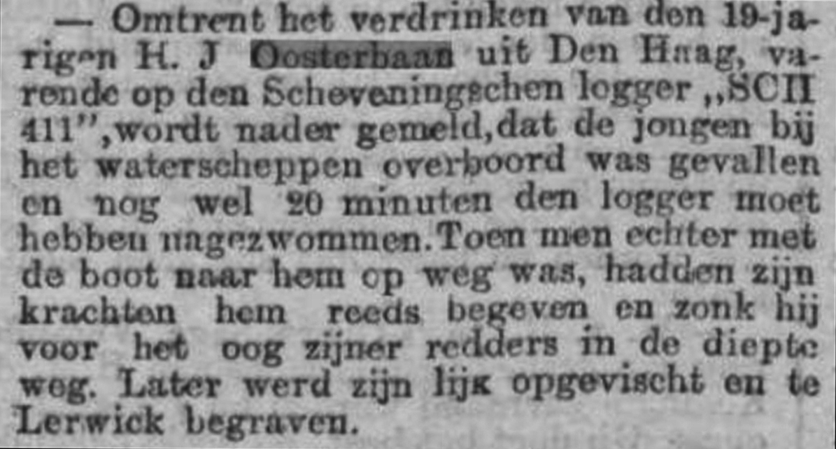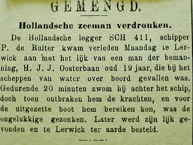Op maandag 17 september liep de zeillogger de baai van Lerwick binnen. Het was al laat in het jaar om nog de Schotse Shetland-eilanden aan te doen maar schipper De Ruiter had deze keus moeten maken om het dode lichaam van Hendrik Jacobus Johannes Oosterbaan aan wal te brengen. De matroos was in volle zee tijdens het ‘slaan van een puts water’ overboord getrokken. Nog 20 minuten zwom hij achter de voortzeilende logger aan. Echter eer de sloep was uitgezet en de drenkeling was bereikt hadden zijn krachten het begeven en was hij onder water verdwenen. Later werd het lichaam nog gevonden, te Lerwick aan wal gebracht en op 19 september op het eiland begraven.