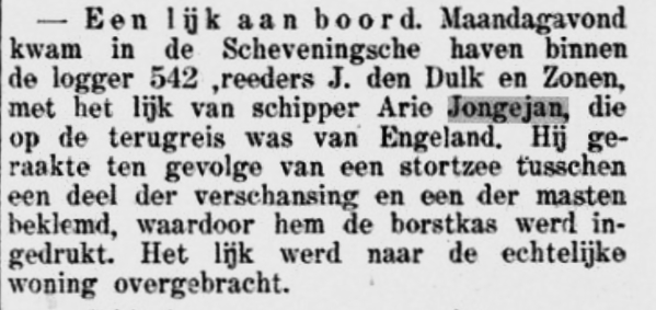 Op 20 januari 1908 zond reder Den Dulk twee van zijn schepen voor de winterharingvisserij naar de noordwestkust van Schotland. Deze vroege vorm van experimentele visserij had tot doel de vissers in hun beroep bezig te houden en een gunstiger resultaat te verkrijgen dan de trawlvisserij op rond- of platvis gedurende de wintermaanden bood. Het was aanvankelijk de bedoeling om het Schotse Stornoway - gelegen op het Hebriden-eiland Lewis- te bereiken om vanuit die vissersplaats, te haringvisserij uit te oefenen. De twee houten zeilloggers de SCH 252 ‘Zeeburg’en de SCH 307 ‘De Hoop’ kregen echter al tijdens de uitreis met veel stormweer te kampen. Hoewel het Caladonian Canal, een verbinding tussen het noordelijk gedeelte van de Noordzee en de westkust van Schotland, al tientallen jaren gereed was kozen de schippers Jongejan en Pronk vermoedelijk voor de meer noordelijke maar verraderlijke doorvaart van de Pentland Firth. Vast staat dat de ‘Zeeburg’ de wateren rond Stornoway niet bereikte en aan vissen is toegekomen. Stortzeeën bestookten de logger waarbij schipper Arie Jongejan tussen een stuk weggeslagen verschansing en de mast bekneld raakte waarbij zijn borstkas werd ingedrukt en enkele uren daarna overleed. Met veel averij aan de logger koos de bemanning voor de terugreis waarna het in de eerste week van februari, met aan boord het lichaam van hun schipper, Vlaardingen binnenliep van waaruit men reder Den Dulk op de hoogte stelde. Op 5 februari kon bij de burgerlijke stand het overlijden van Arie Jongejan worden aangegeven.