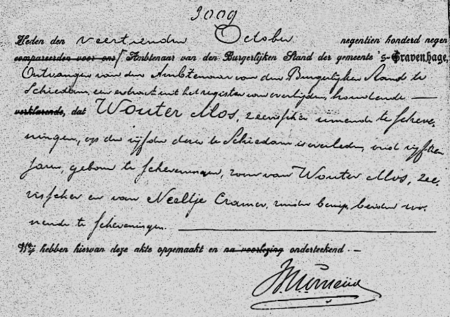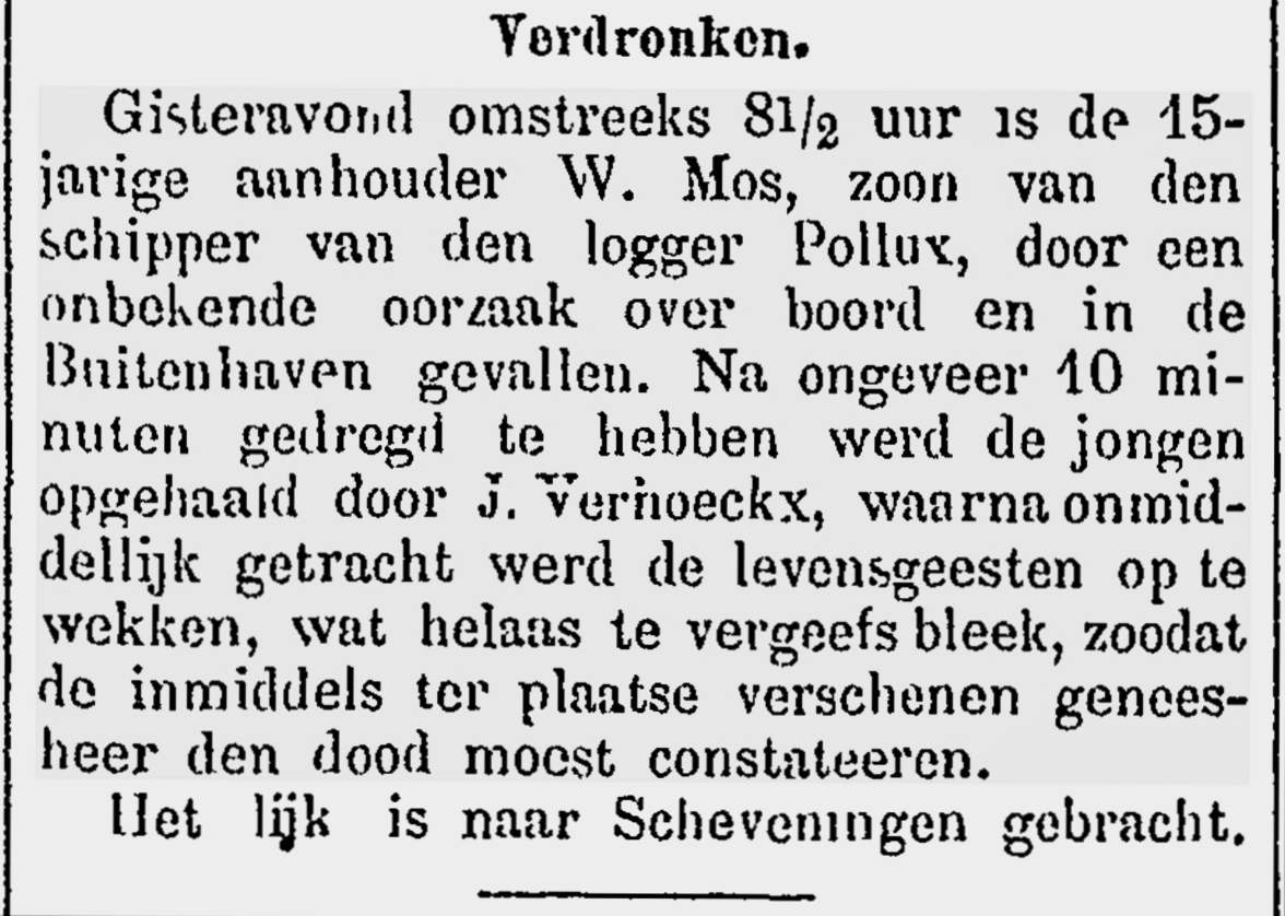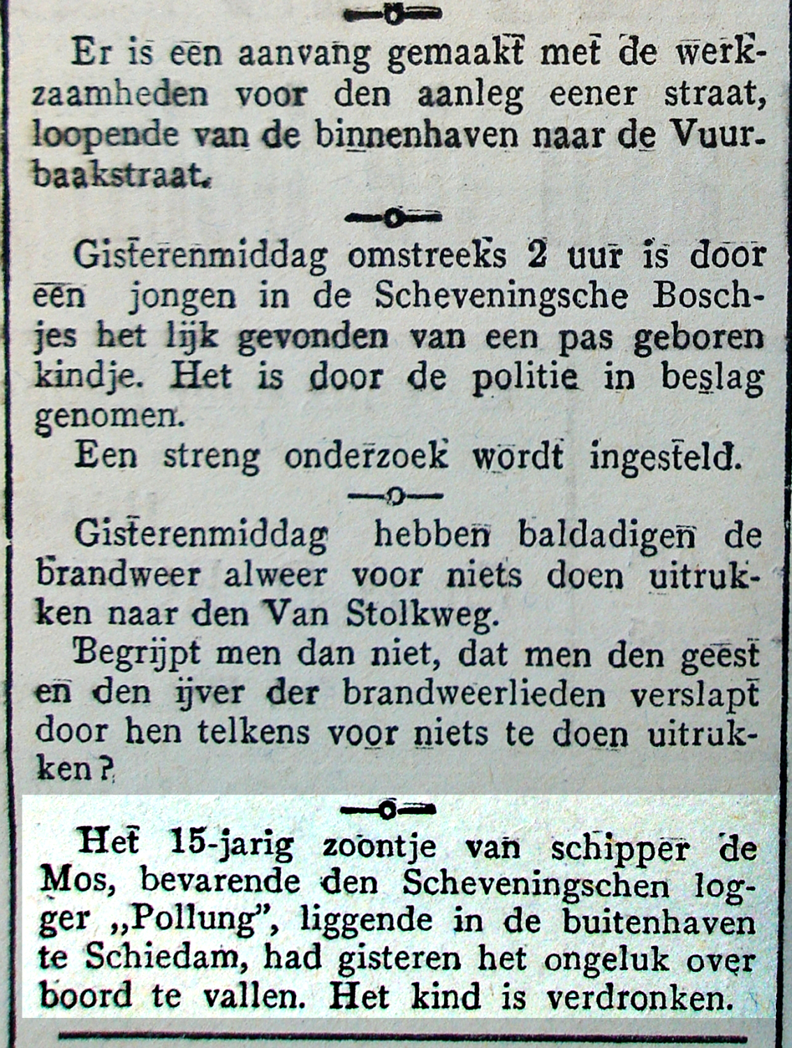In de buitenhaven van Schiedam was van de vissloep de zoon van de schipper -eveneens Wouter geheten- bij het aan boord gaan van de loopplank gevallen en verdronken.