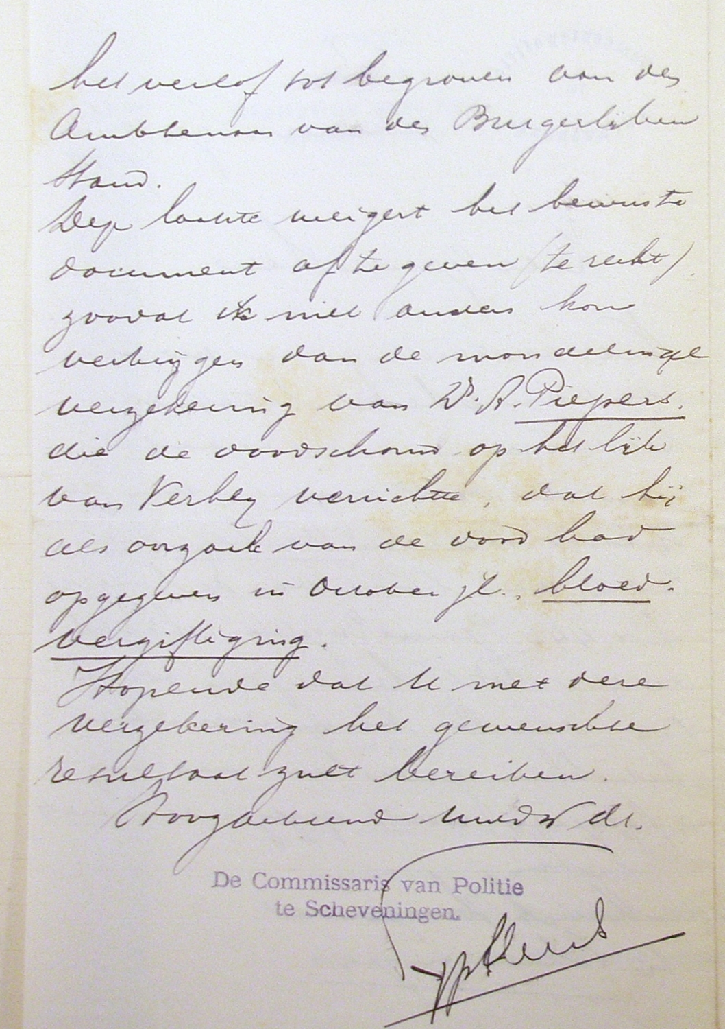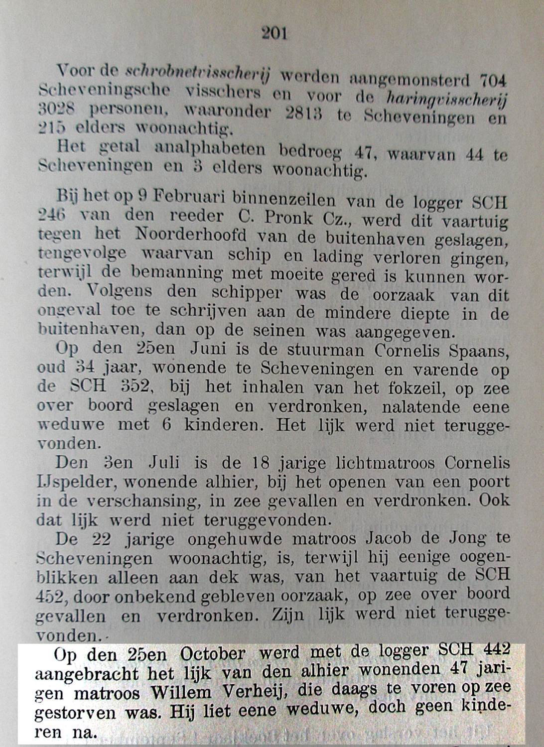 De aan boord overleden Willem Verheij had zich met het haringkaken in de vinger gesneden. Hij kreeg daarna bloedvergiftiging waarvoor hij door de arts van de H.M. ‘Dolfijn’nog werd behandeld. Verheij overleed echter toch. Het lichaam werd aan wal gebracht.