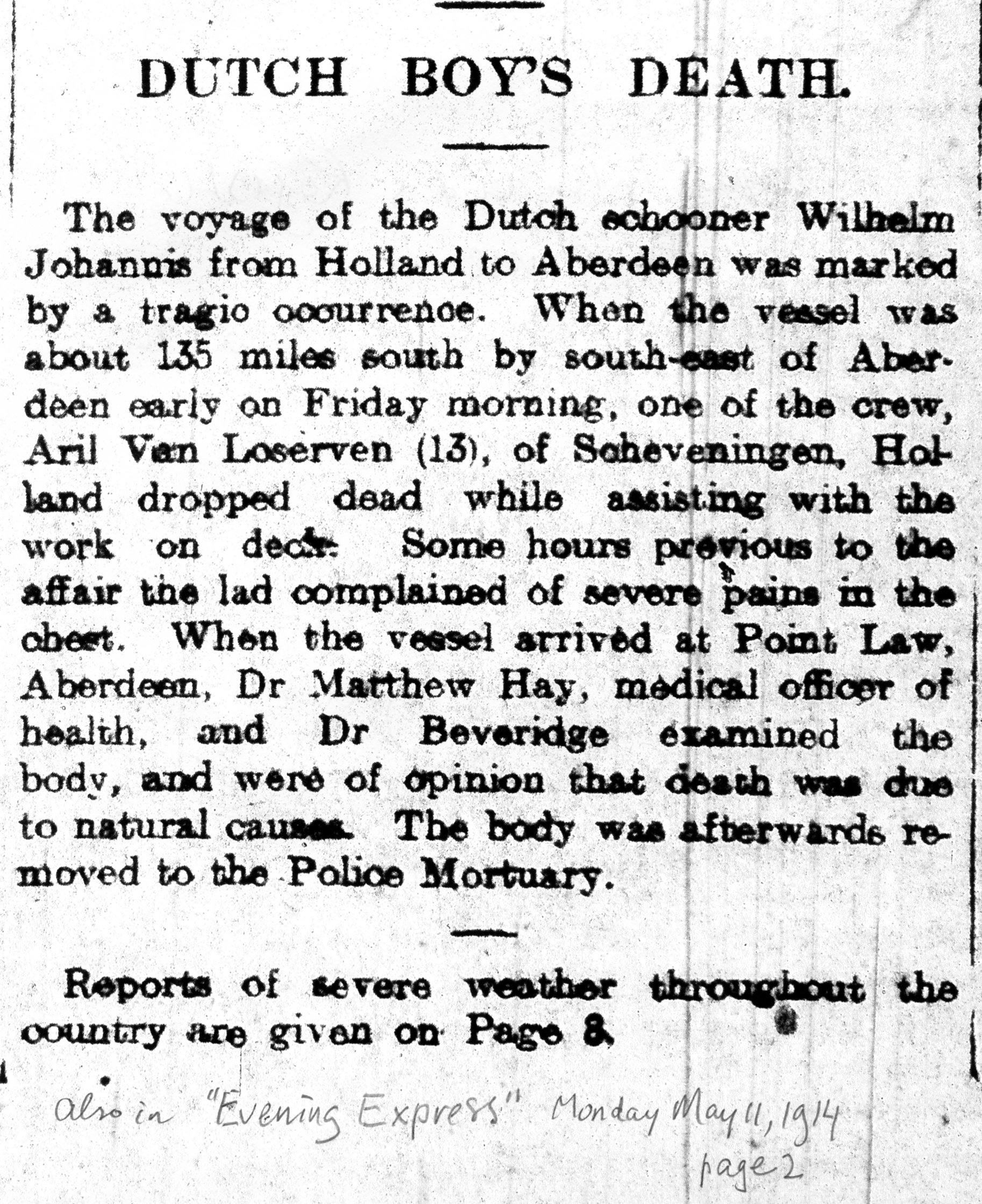 Aan boord overleed plotseling Arie van Leeuwen. Het lichaam werd in het Schotse Aberdeen begraven.