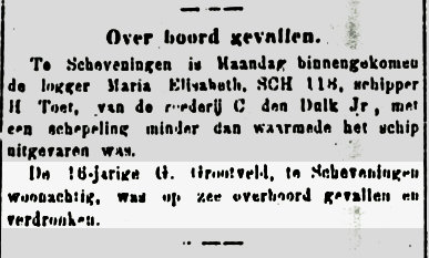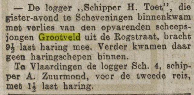 Tijdens het innemen van het bezaanzeil sloeg Cornelis Grootveld overboord en kon niet meer worden gered.