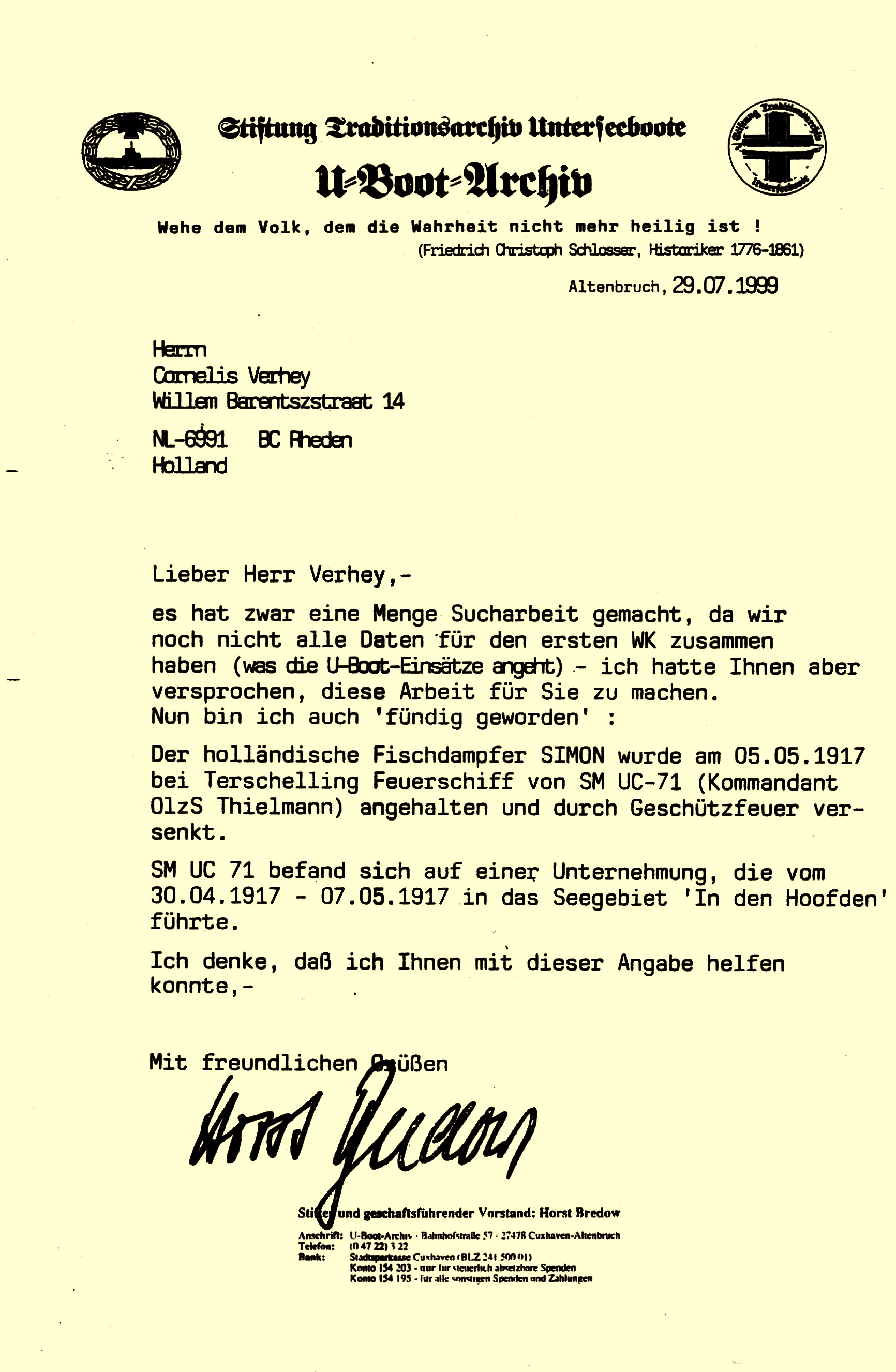 * Een in de jaren-90 verricht onderzoek in het Duitse U-Boot-Archiv liet zien dat de HVH 2 'Simon' door de U-Boot S.M. UC-71 op 5 mei 1917 met geschutsvuur tot zinken is gebracht. Hierbij is de gehele bemanning omgekomen. In 1919 zonk de U-Boot nabij Helgoland.