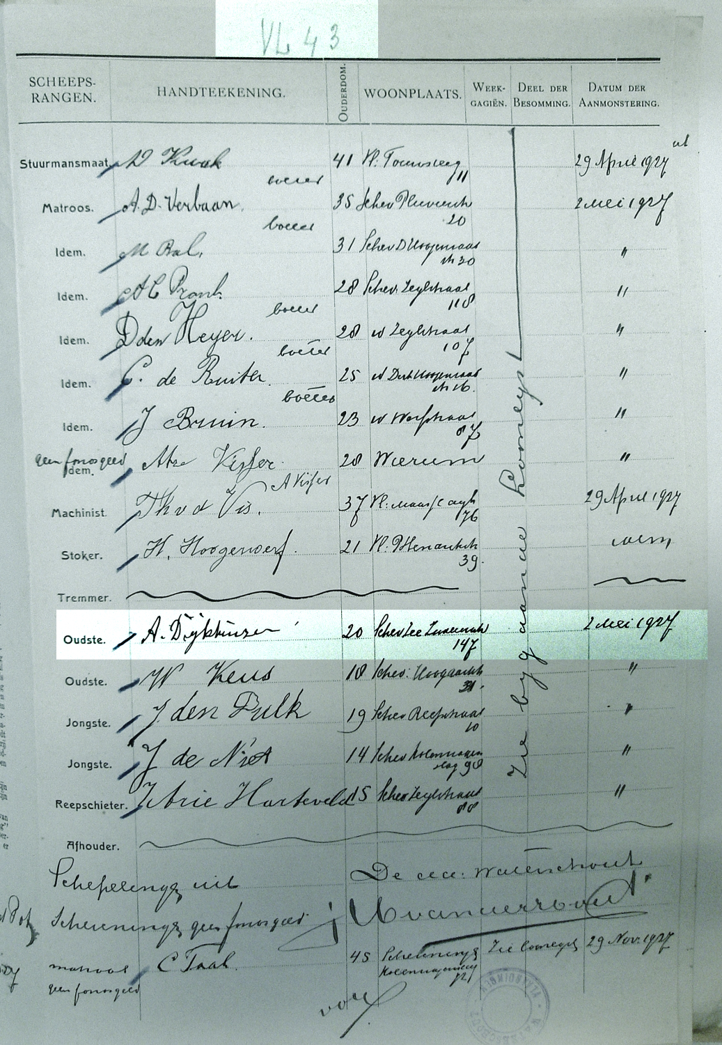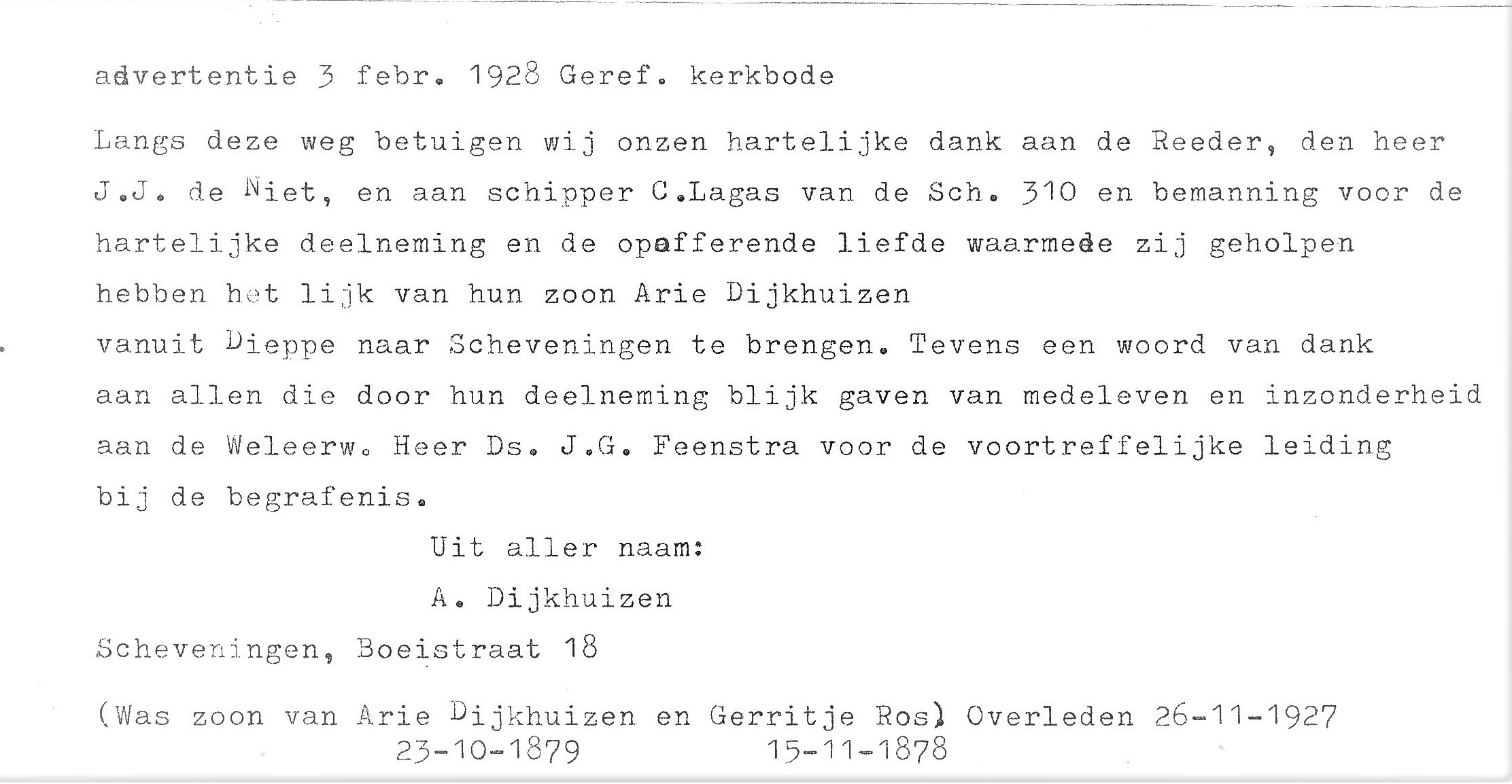 In het Franse Dieppe werd Arie Dijkhuizen vermist. Pas in januari 1928 werd zijn lichaam in de haven gevonden en met de SCH 310 op de 27e januari naar Scheveningen gebracht.