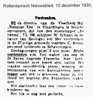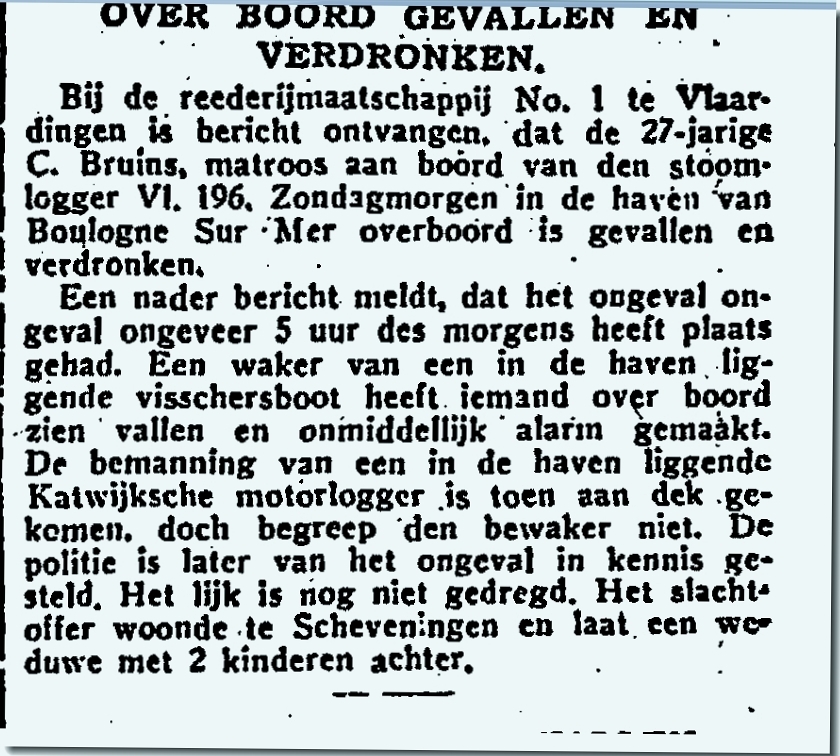 Cornelis Bruijn matroos op de stoomlogger, was in de haven van het Franse Boulogne Sur Mer overboord gevallen en verdronken. Hij liet een weduwe en twee kinderen na.