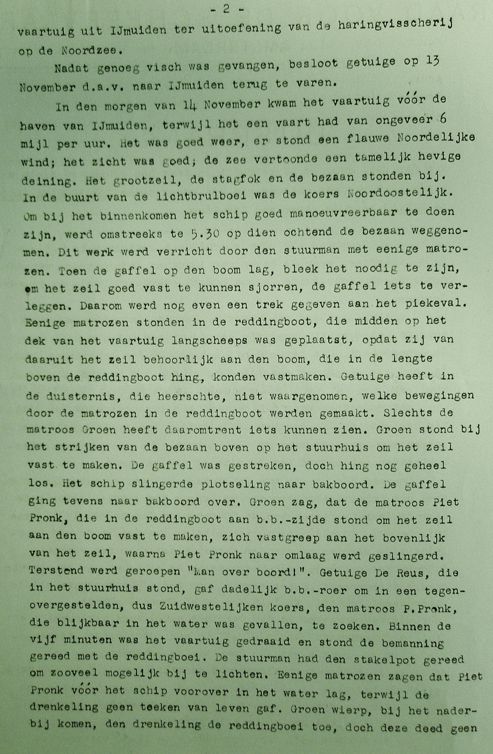 Tijdens het innemen van het gatzeil, circa twee mijlen van IJmuiden, viel matroos Pieter Pronk vanaf de sloep eerst op de verschansing en vervolgens, bewusteloos of al overleden, overboord en verdronk. Het lichaam spoelde op 14 december, twee kilometer ten noorden van Egmond a/zee, op het strand aan. Het lichaam werd naar Katwijk a/zee vervoerd alwaar hij werd begraven.