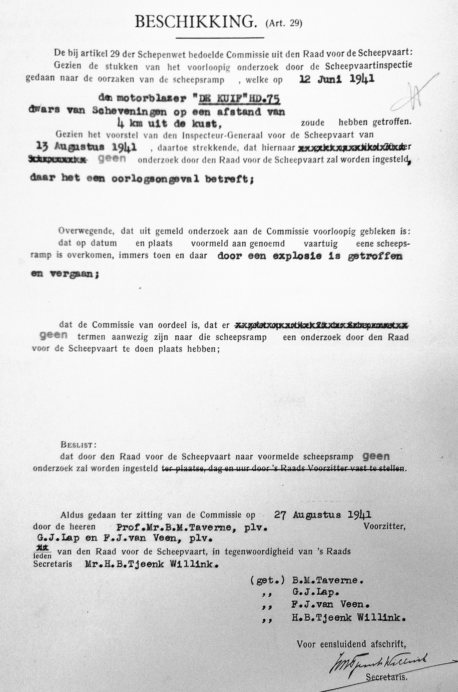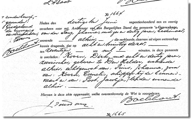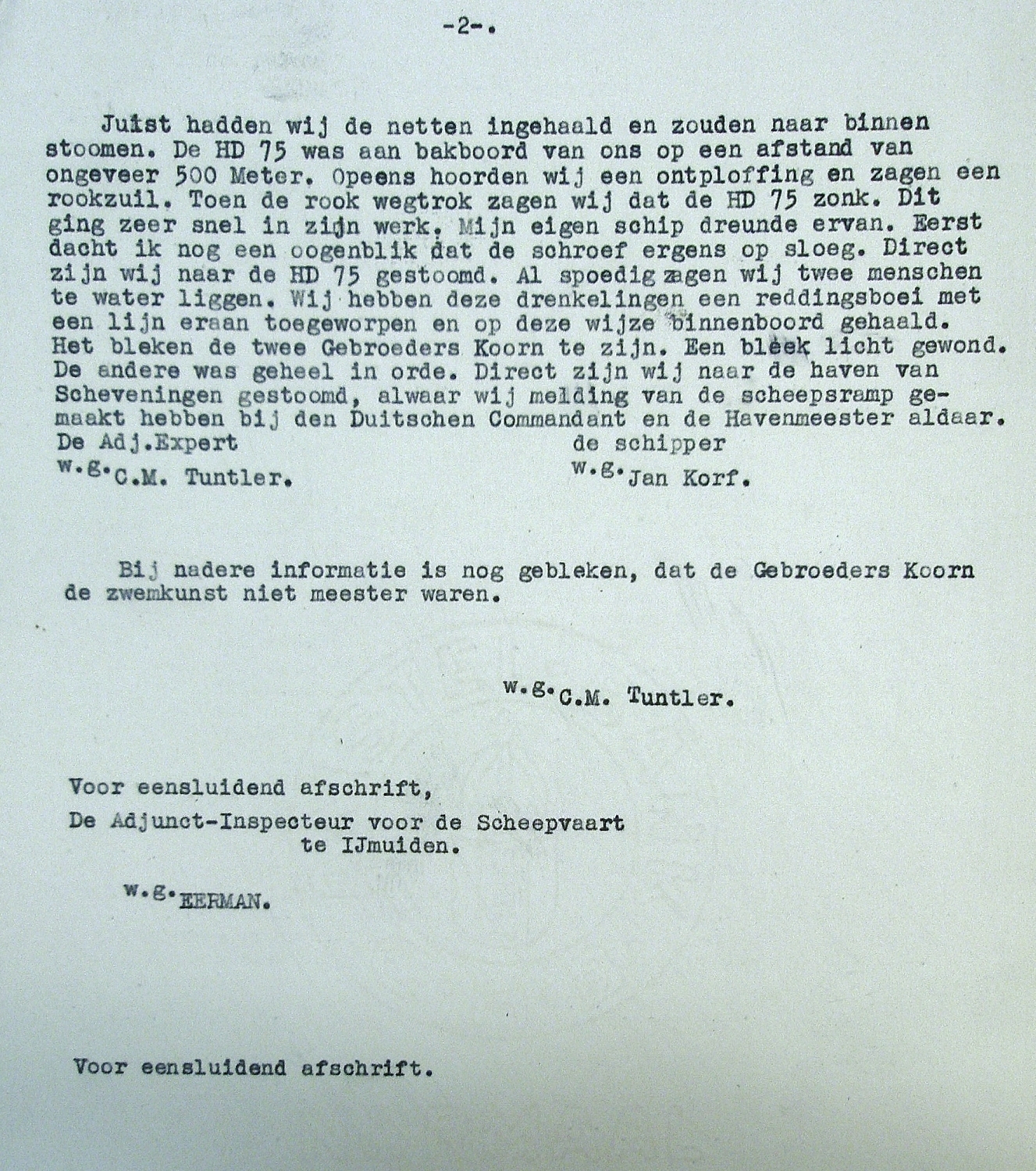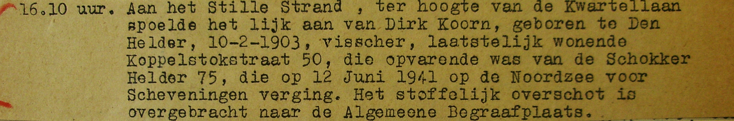 De uit Den Helder afkomstige familie Koorn was aan het begin van de Tweede Wereldoorlog naar Scheveningen gekomen. Woonachtig in de Doornstraat deden zij vanuit Scheveningen aan de kustvisserij. Met de houten motorblazer krijgen zij een torpedo in het net die langszij van het schip ontploftte. De broers Dirk- en Lubbert Koorn komen hierbij om het leven. Het lichaam van Lubbert spoelde op 26 juni op het strand van de Wassenaarse Slag aan. Dirk spoelde op 28 juni tussen Kijkduin en Scheveningen aan. Beide werden begraven op de Algemene Begraafplaats van Huisduinen.