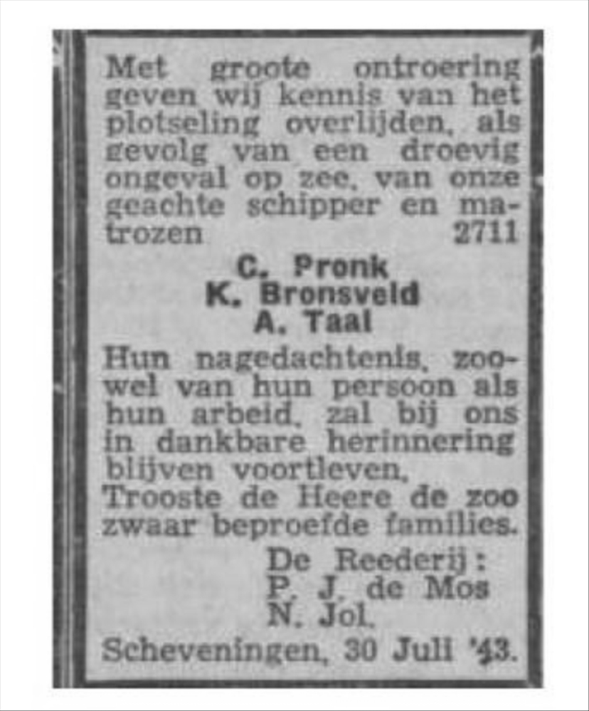 Cornelis Pronk werd ook uit het water gehaald maar overleed enige ogenblikken daarna.