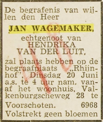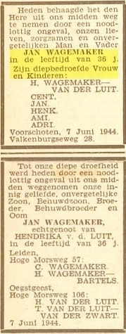 Jan Wagemaker was in 1908 geboren te Den Haag vertrok achtereenvolgens in 1930 naar Oegstgeest en in 1937 naar Katwijk a/zee. Moest in 1943 evacueren naar Voorschoten.