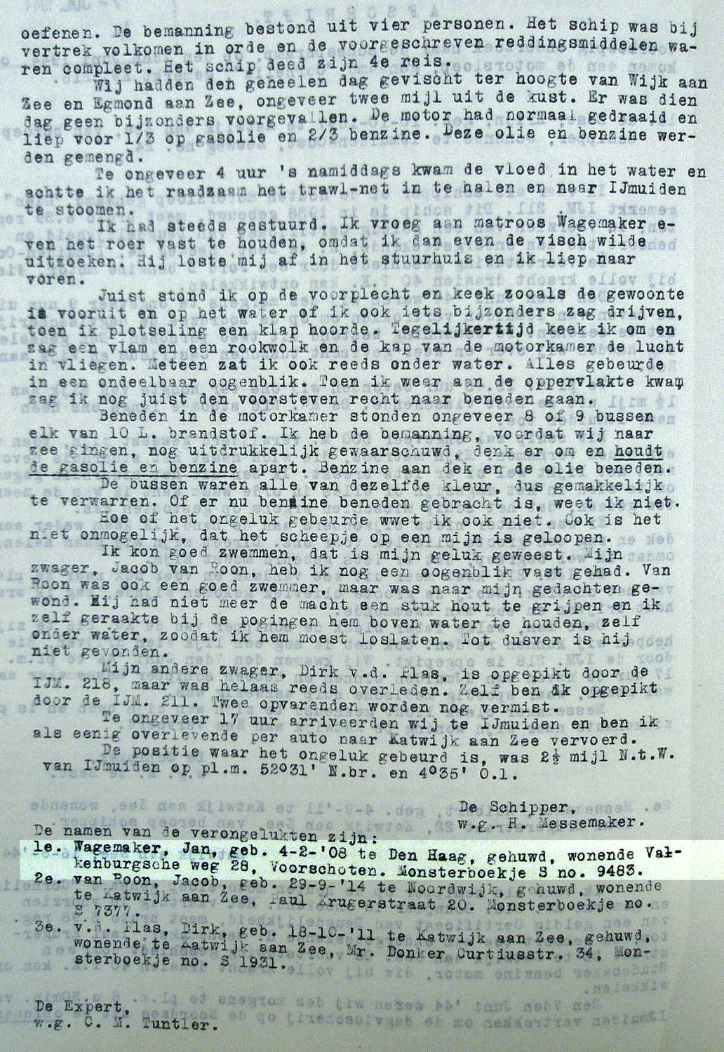 Ter hoogte van Wijk a/zee, circa twee mijl uit de kust, explodeerde plots de houten motorsloep en zonk. Daarbij kwamen de Katwijker Dirk van der Plas en de Noordwijker Jacob van Roon en de 36-jarige geboren Hagenaar Jan Wagemaker om het leven.