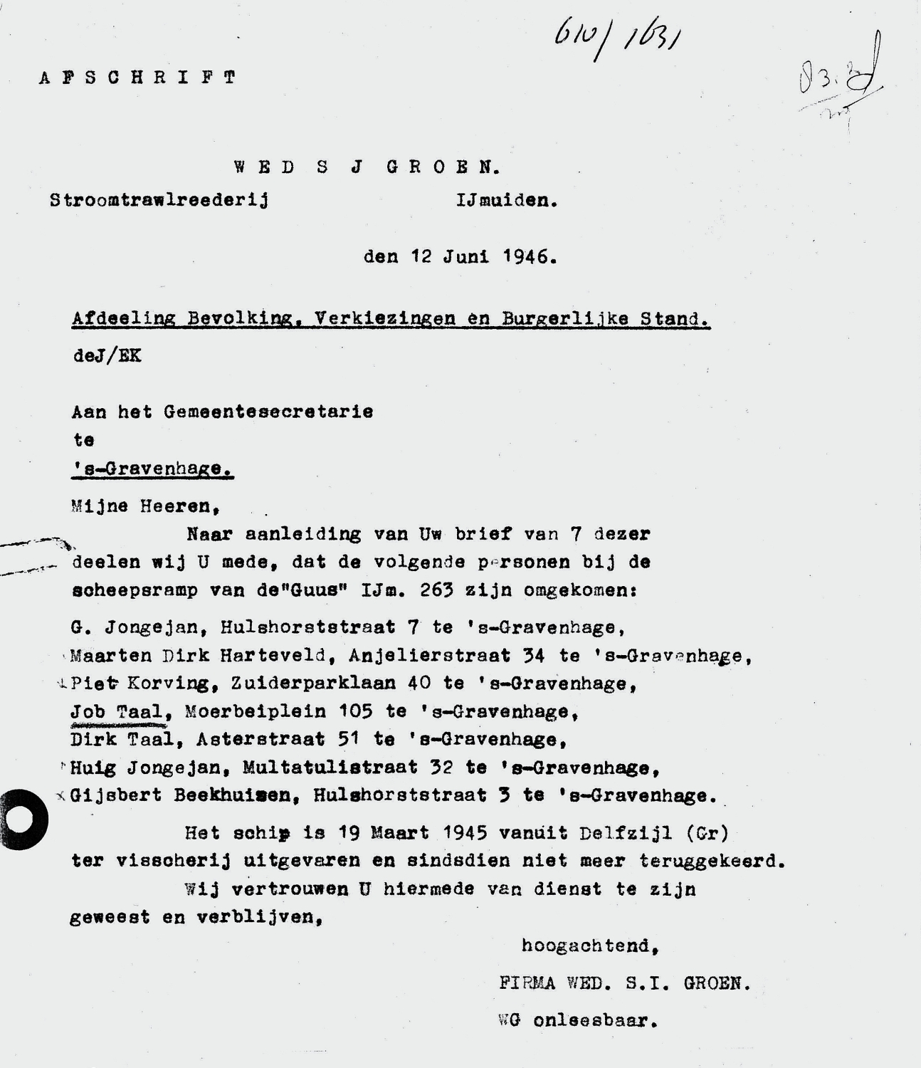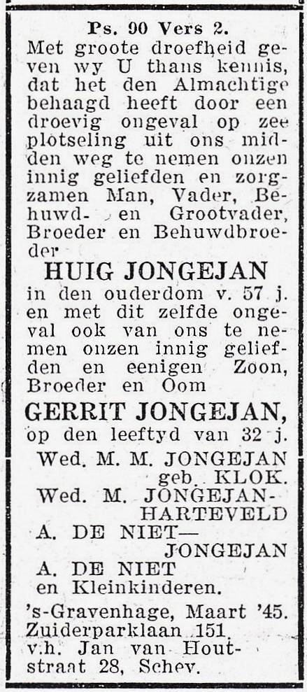 * Gijsbert Beekhuizen: zijn vader Arie- kwam in dezelfde maand om op de SCH 65 'Onderneming'.
