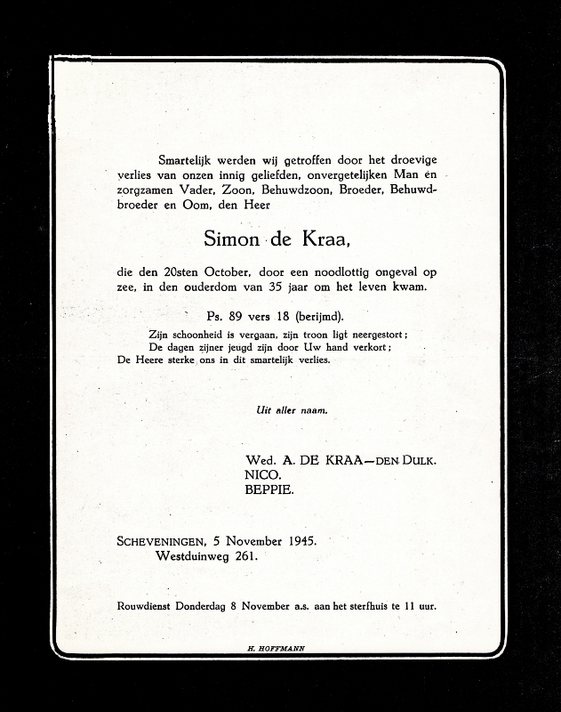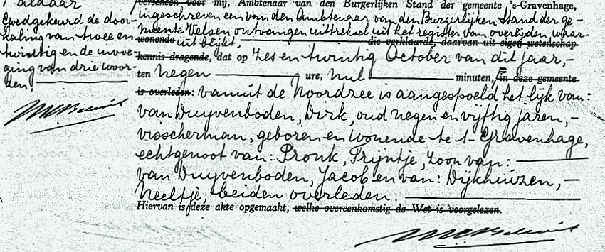 * Dirk van Duijvenbode: zijn vader Jacob- kwam in oktober 1903 om op bomschuit SCH-1 'Clara Johanna.' Zijn broer Cornelis- kwam in september 1911 om op de SCH-460 'Rotterdam.