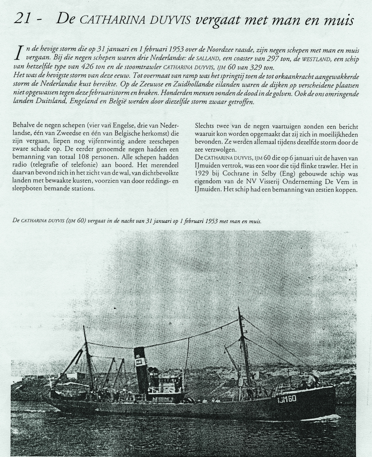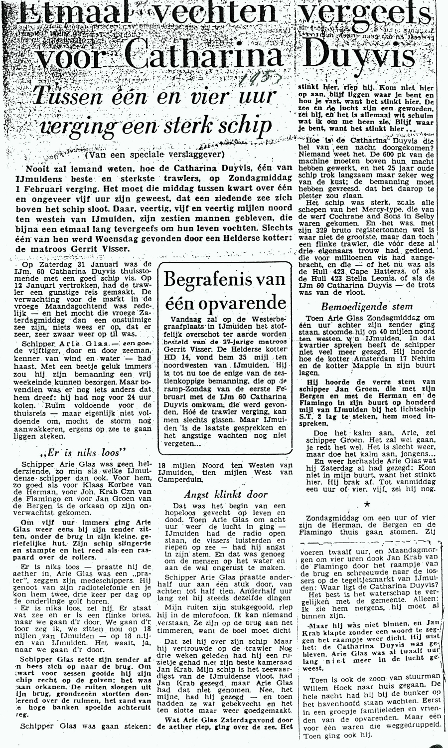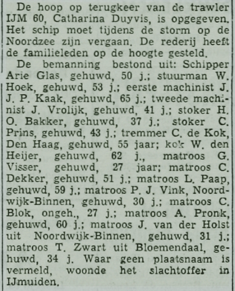 * Een maand na de ramp werd met de kotter HD 14 'Twee Gebroeders' op 35 mijl ten NW van IJmuiden het lichaam van matroos Visser opgevist.