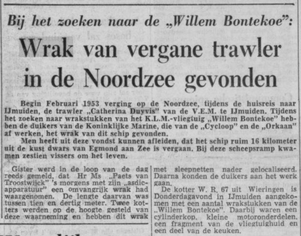 * Toen men in september 1954 op zee naar het verongelukte KLM-vliegtuig 'Willem Bontekoe' zocht, stuitte men op circa 16 kilometer uit de kust van Egmond aan Zee op het wrak van de gezonken 'Catharina Duyvis'.