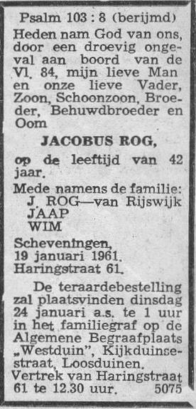 Tijdens storm overboord geslagen en verdronken Jacobus Rog. Het lichaam kon aan wal worden gebracht.