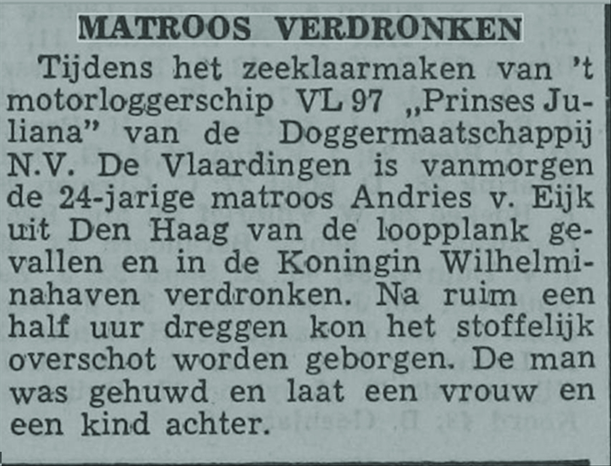 Naar verluidt gleed bij het aan boord gaan van de matroos Andries van Eijk de loopplank van het potdeksel. Hierbij raakte de Andries van Eijk te water en verdronk. Na ruim een half uur dreggen kon het lichaam worden geborgen. Andries van Eijk was geboren te Monster maar woonde in Den Haag.