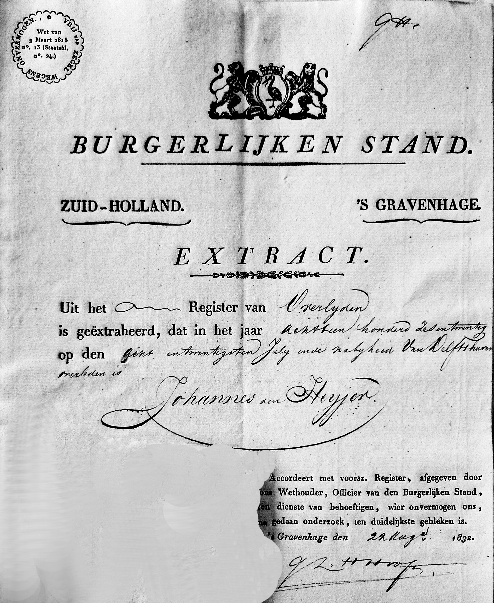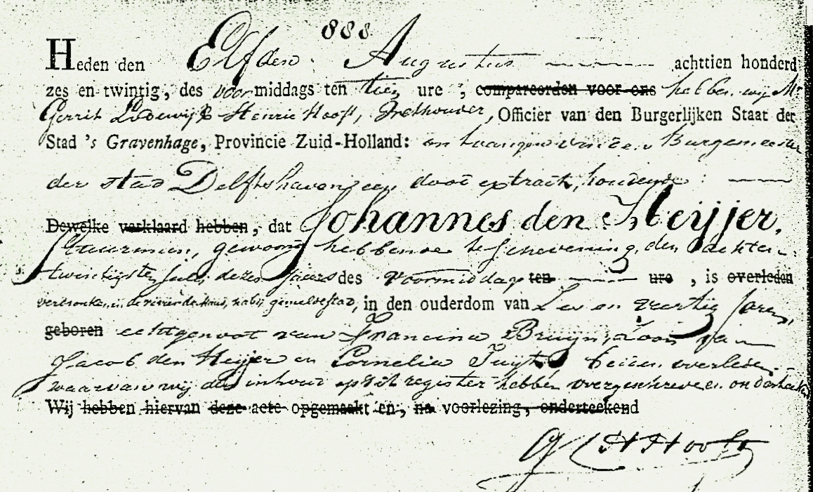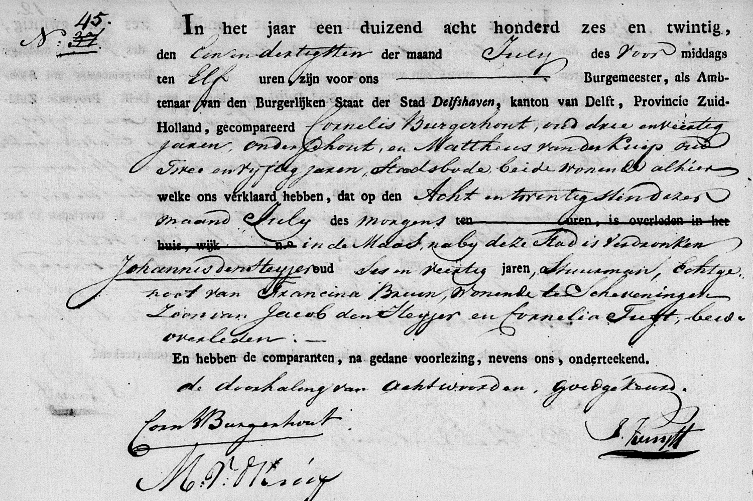 Nabij Delfshaven verdronk de stuurman Johannes den Heijer in de Maas. Het lichaam werd gevonden en op 2 augustus te Scheveningen begraven.