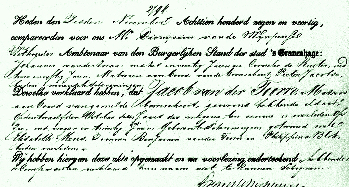 Slechts de aangifte van Johannes van der Zwan en Cornelis de Ruiter -matrozen van de genoemde bomschuit- meldt dat matroos Jacob van der Toorn op zee is overleden. De visser was ter hoogte van Yarmouth tijdens stormweer overboord geslagen en verdronken.