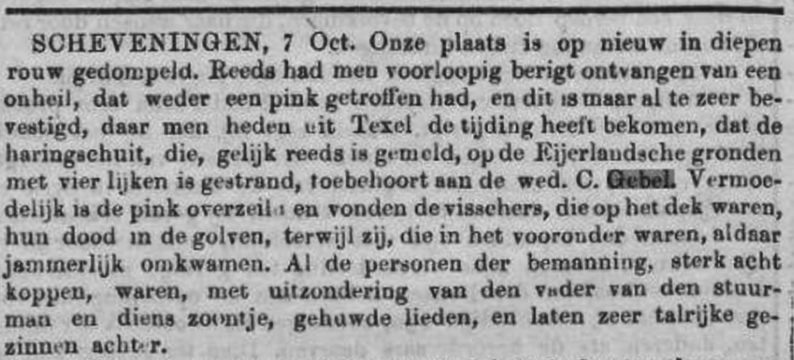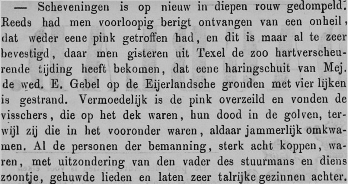Op 7 oktober kwam er van Texel het bericht dat daar op de Eijerlandsche gronden een Scheveningse haringschuit was gestrand. In het vooronder van het schip bleken zich vier lijken te bevinden. Het vermoeden bestond dat de schuit Johanna Gébel was overzeild waarbij nog vier andere, zich aan dek bevindende vissers, hun dood in de golven hadden gevonden. Daarnaast had het ook gestormd in die dagen waarbij de schuit over de banken bij de Eijerlandsche gronden kon zijn geslagen. Met uitzondering van de zoon van stuurman Pieter Korving waren alle schepelingen vaders van huisgezinnen. Tweeëntwintig kinderen verloren daarbij hun vaders. Scheveninger Albert Mos schoot met dit drama de rederes Gébel, te hulp. Hij vertrok nog op de dag van het bericht met een pink van stuurman A. Kuiper naar Texel om de gevonden lichamen voor het begraven te identificeren. Daarnaast zouden Mos en Kuiper de staat van het schip inspecteren of het mogelijk zou zijn om het schip naar Scheveningen terug te halen.