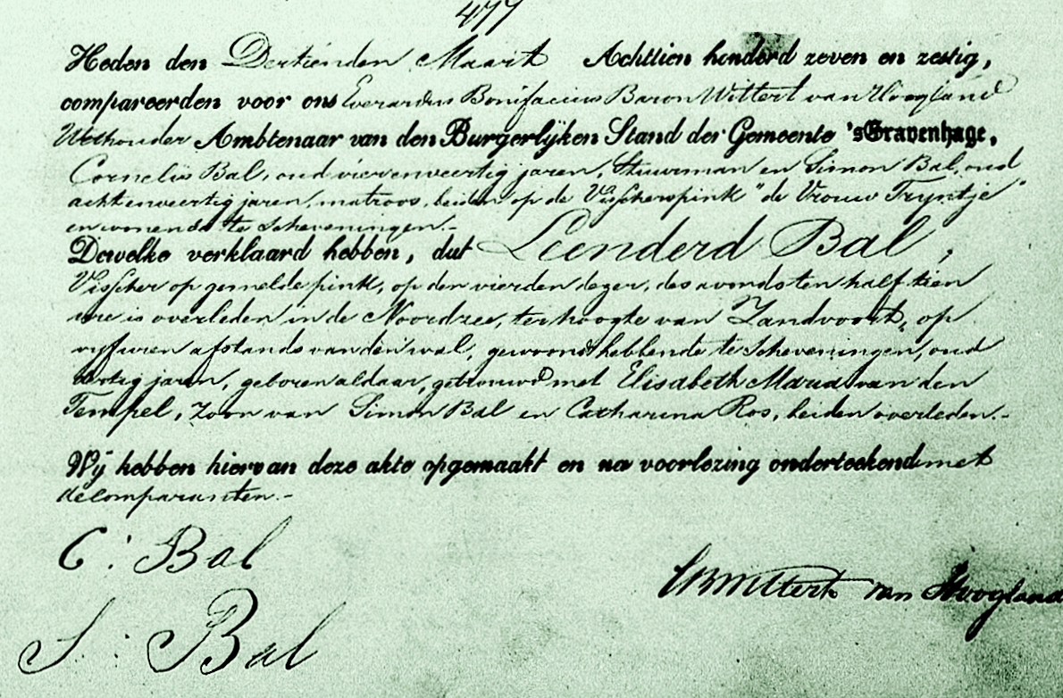 In de tweede week van maart kwam uit het Duitse Hamburg een bericht naar Scheveningen voor reder Korving. Zijn pink was, ter hoogte van Zandvoort op 5 uren afstand van de wal, door een Franse stoomboot overvaren en in een oogwenk gezonken aldus het bericht. Op wonderbaarlijke wijze - zo schreef stuurman Bal- kon de bemanning op één na heelhuids overstappen op de stoomboot. Matroos Leendert Bal, slaagde daar niet in en zonk met het schip.