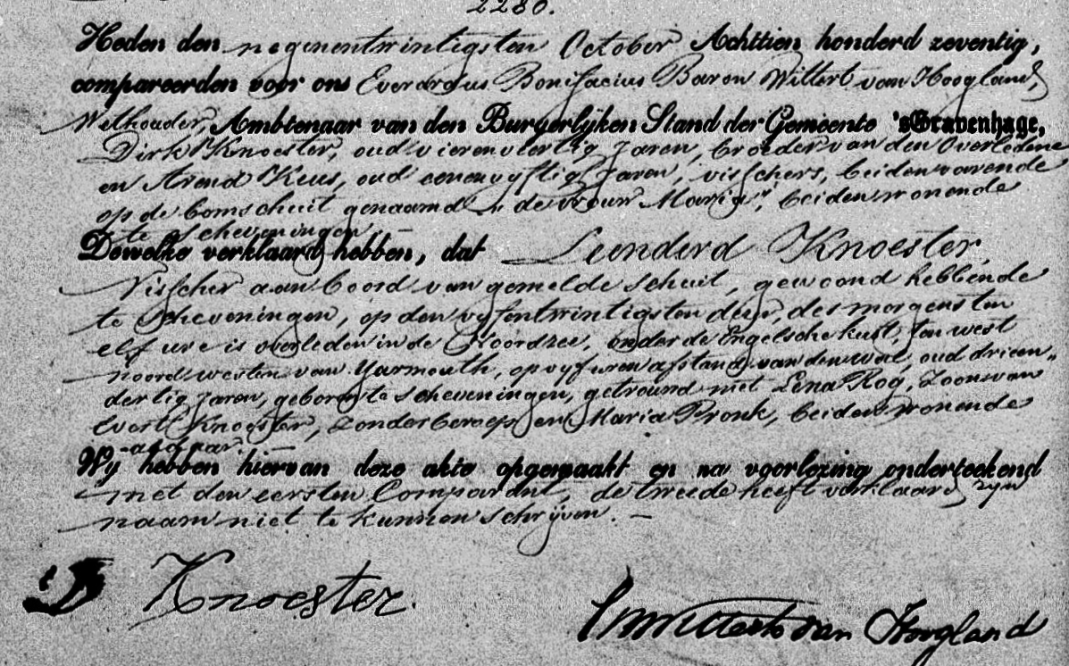 Op de pink van reder en stuurman Gerrit Zier Jol was men juist bezig onder de Engelse wal te vleet in te halen toen er een stortzee over kwam. Matroos Leenderd Knoester, die naast het spil stond werd door de klap overboord geslagen. De bemanning liet alles uit de handen vallen en snelde toe. Een spaak van het spil werd hem toegestoken maar dat bleek niet de oplossing waarna hem enkele touwwerken werden toegegooid waarvan Knoester er één kon grijpen. Toen hij met behulp van het touw tot tegen het schip aan werd getrokken kon zijn eigen broer hem bij de kleren vatten om de drenkeling om boord te hijsen. Echter het korsjak van Leendert scheurde waarna hij alsnog in de diepte zonk. Leenderd Knoester liet een weduwe en vier kinderen na. Bovendien was één van zijn andere broers in augustus op de pink De Jonge Maria omgekomen aldus het krantenbericht van destijds.